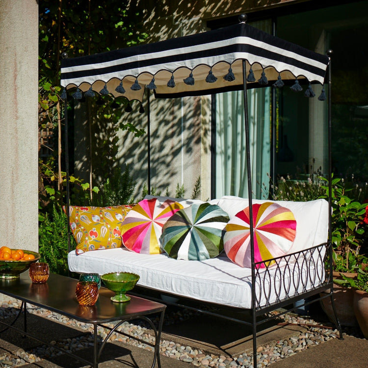 Our Palm Springs Collection includes a metal sofa, a chair and a canopied daybed. There are three different colours to choose from - a low key gold, white or gunmetal.