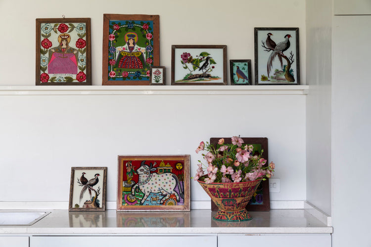 An Indian glass painting of a yellow and green bird on a branch (Large)