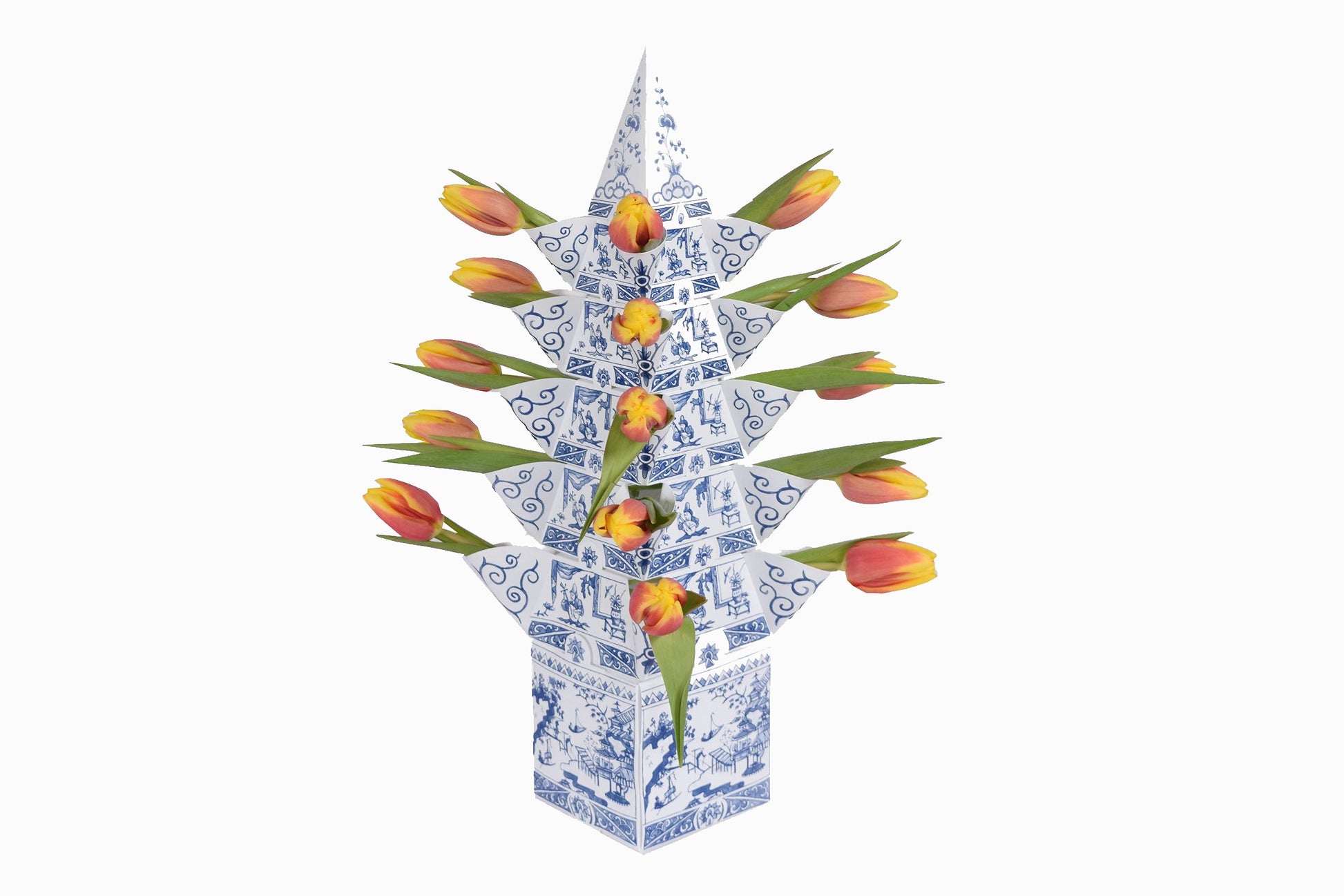 Una versión en papel de un jarrón de tulipanes tradicional de Delft, diseñado por Piet Design. El jarrón viene empaquetado desmontado para que lo montes en casa, proporcionando diversión colaborativa para toda la familia. El papel está forrado de plástico para que puedas llenarlo de agua. Esto nutre las flores y aporta peso y estabilidad al jarrón.