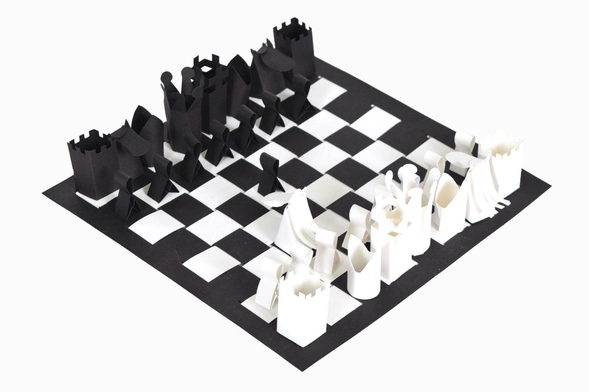 Un juego de ajedrez de papel plano para montar en casa, diseñado por Piet Design de los Países Bajos.