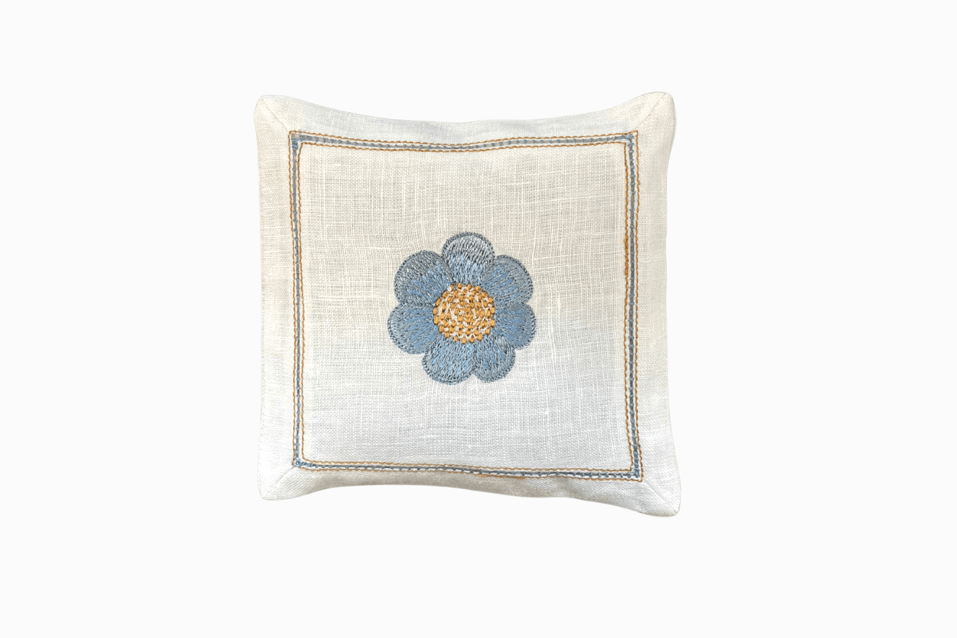 A pretty, cream linen lavender cushion, hand emboidered with a blue flower and ladder stitching.