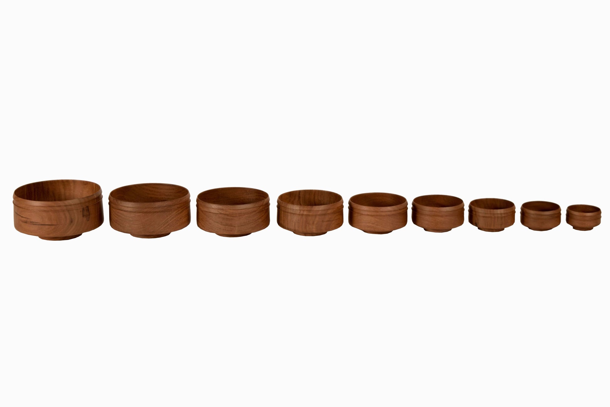 Un conjunto de finos cuencos apilables de madera de Rohida que utilizan los monjes jainistas en la India para recolectar donaciones. La madera procede del desierto de Thar.