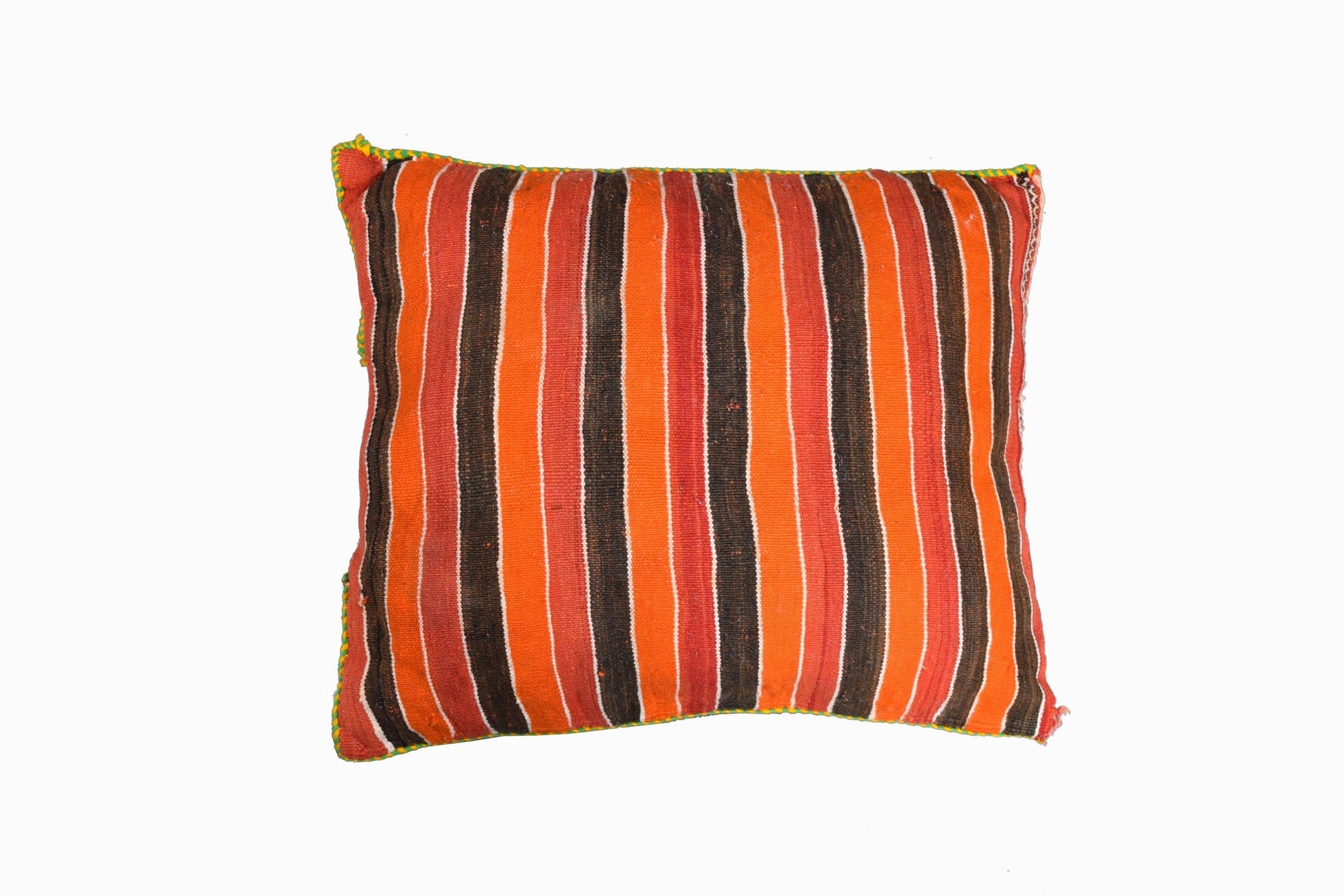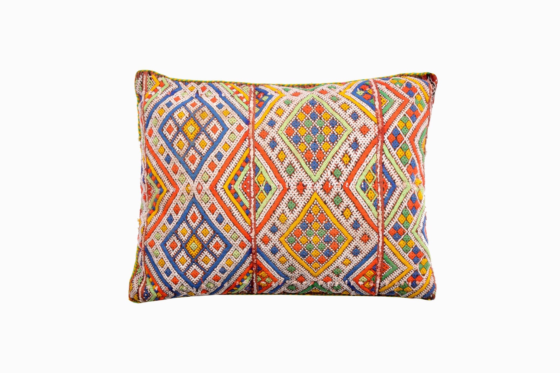 Un cojín vintage de lana de colores brillantes procedente de Marruecos bordado con un patrón de rombos en azul, verde, naranja y amarillo.