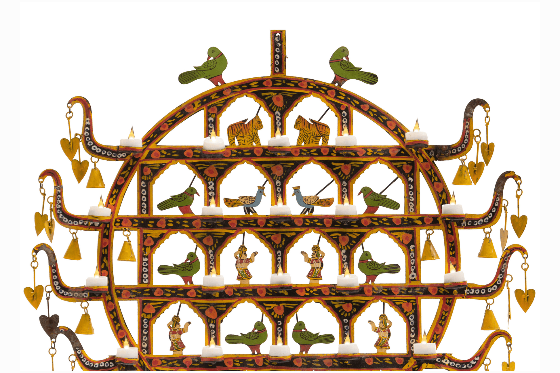 A hand cut and painted tealight holder depicting numerous birds and animals. Just lovely!