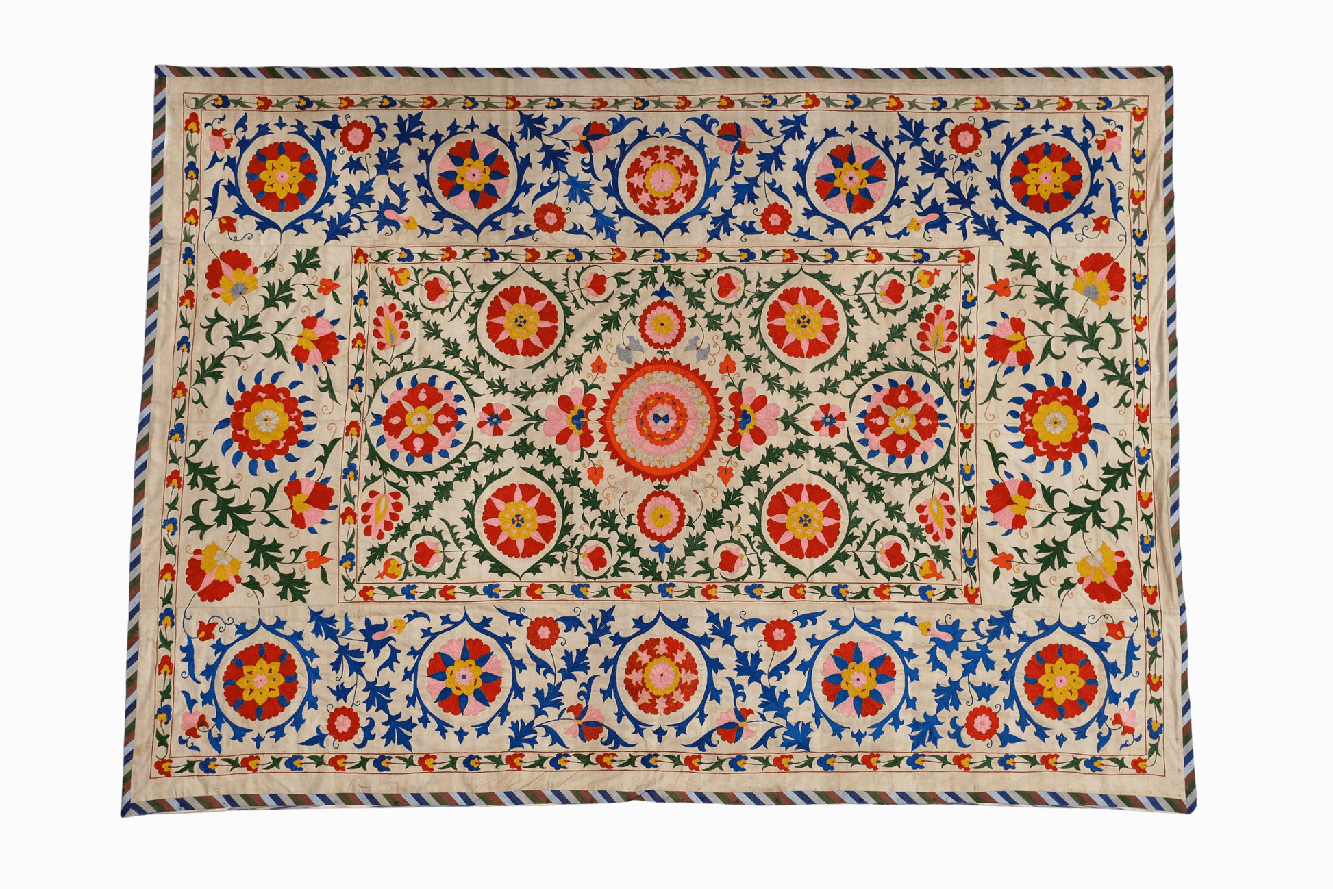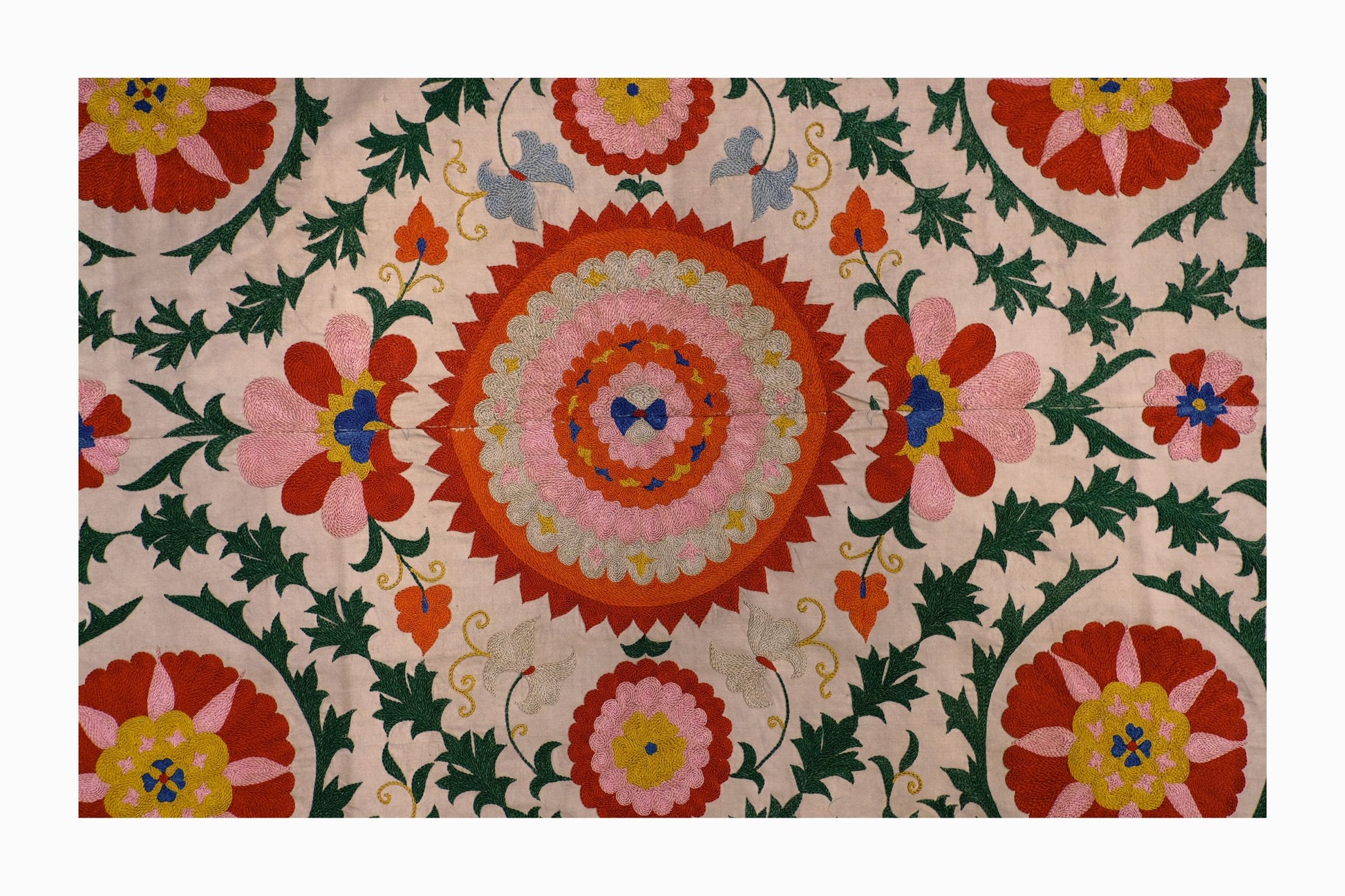 A spectacular multicoloured, embroidered Suzani bedspread big enough for a large double bed - or to beautify a sad and empty wall!