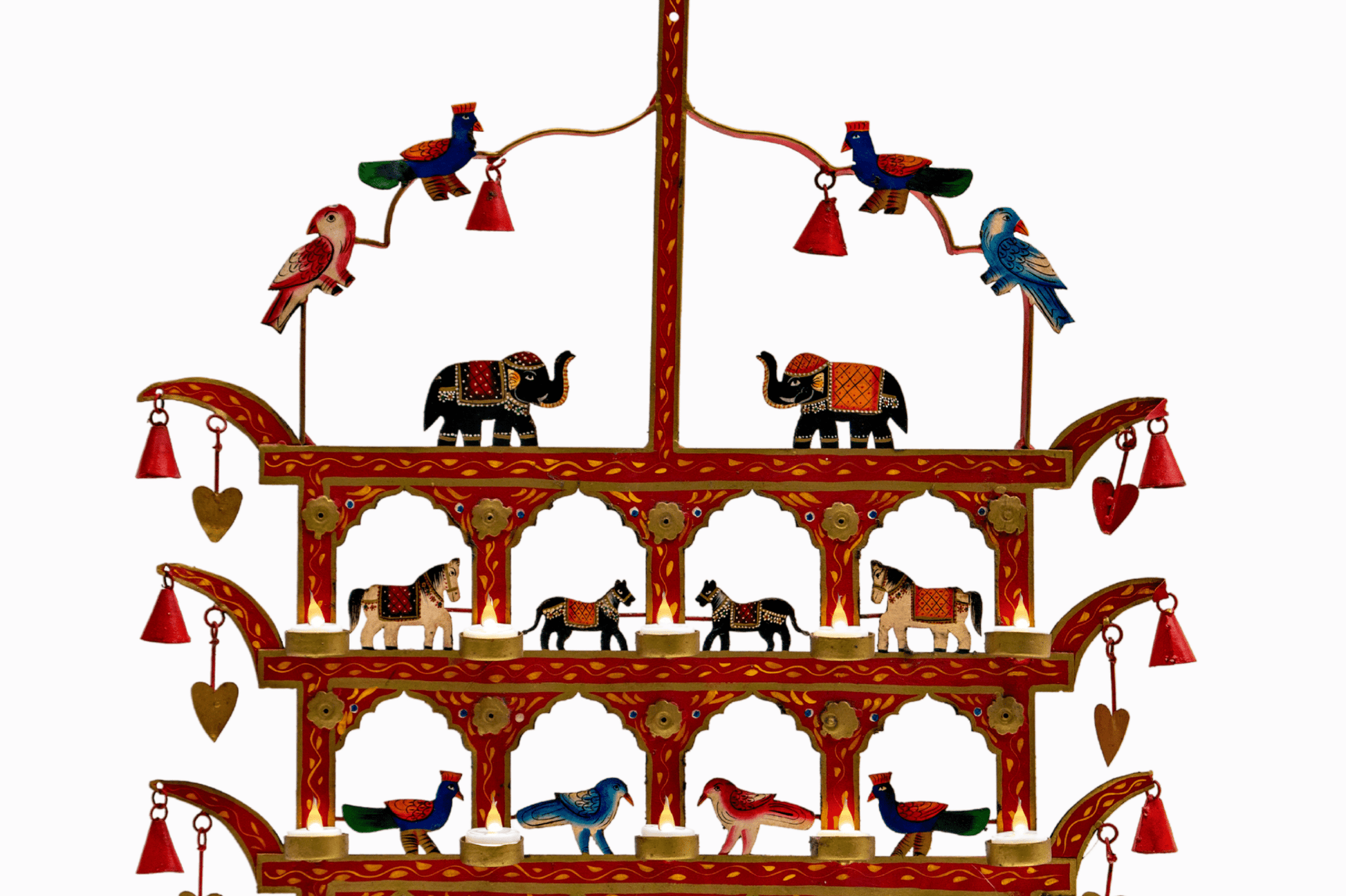 Depicting birds and animals and adorned with pendants and bells, this magnificent candleholder will light up your life!