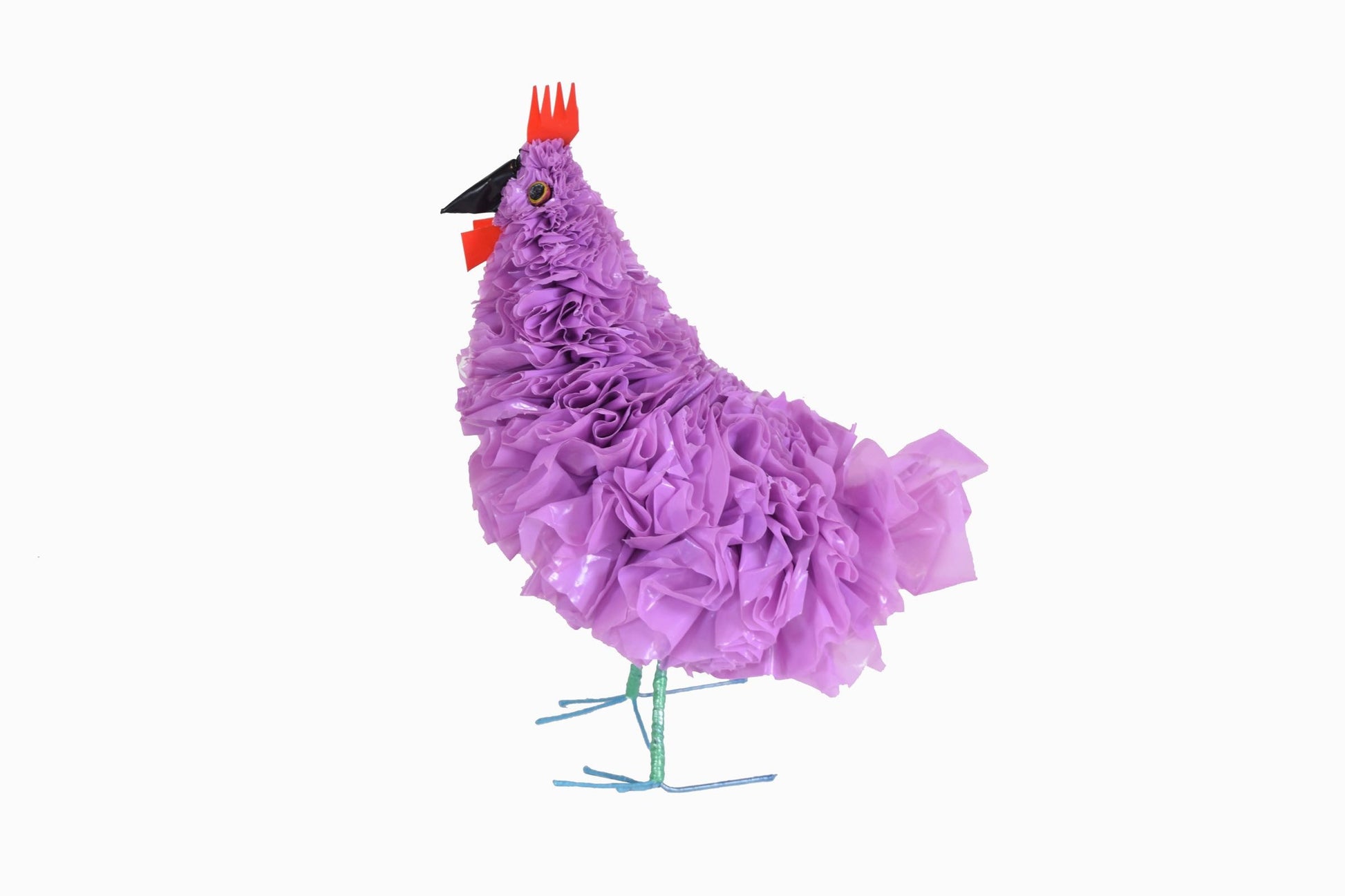 Estos divertidos adornos de pollo se fabrican en los municipios de Johannesburgo, Sudáfrica, a partir de bolsas de plástico recicladas.