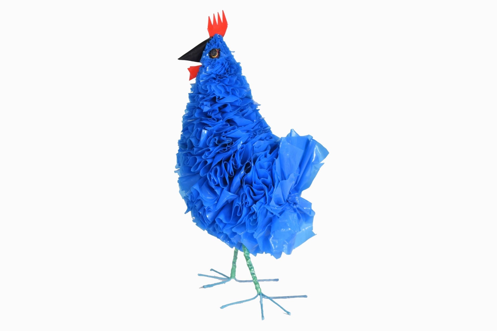 Este divertido adorno de pollo azul está fabricado en los municipios de Johannesburgo, Sudáfrica, a partir de bolsas de plástico recicladas.