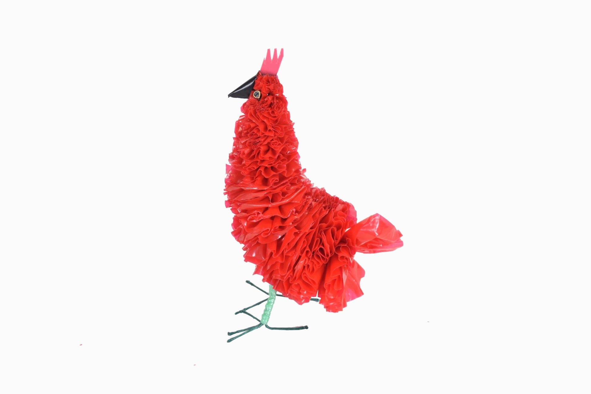 Estos divertidos adornos de pollo se fabrican en los municipios de Johannesburgo, Sudáfrica, a partir de bolsas de plástico recicladas.