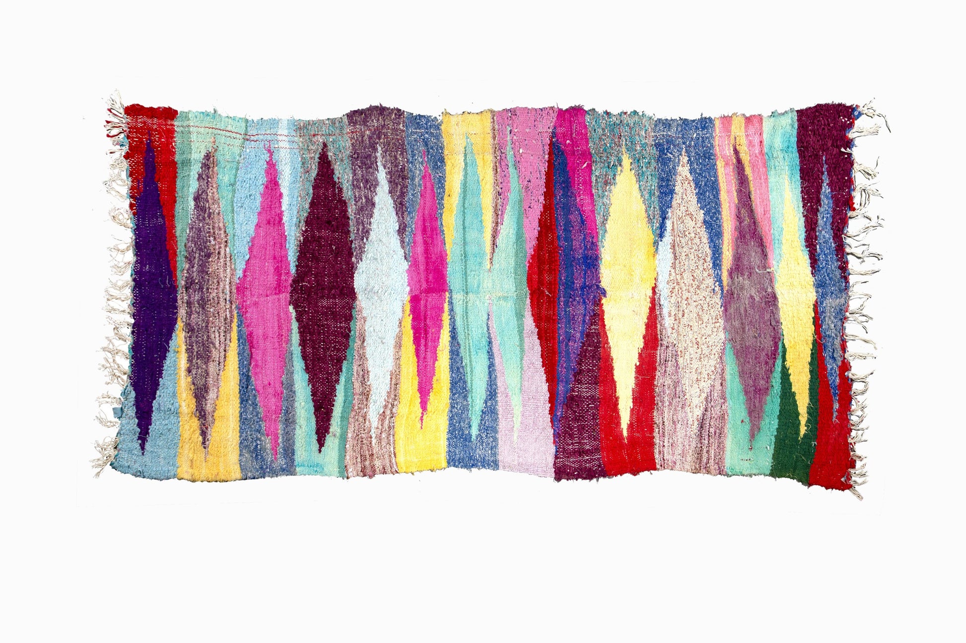 Una alfombra boucherouite bereber de colores vibrantes procedente de las montañas del Atlas en Marruecos, con un fabuloso diseño jazzístico contemporáneo.