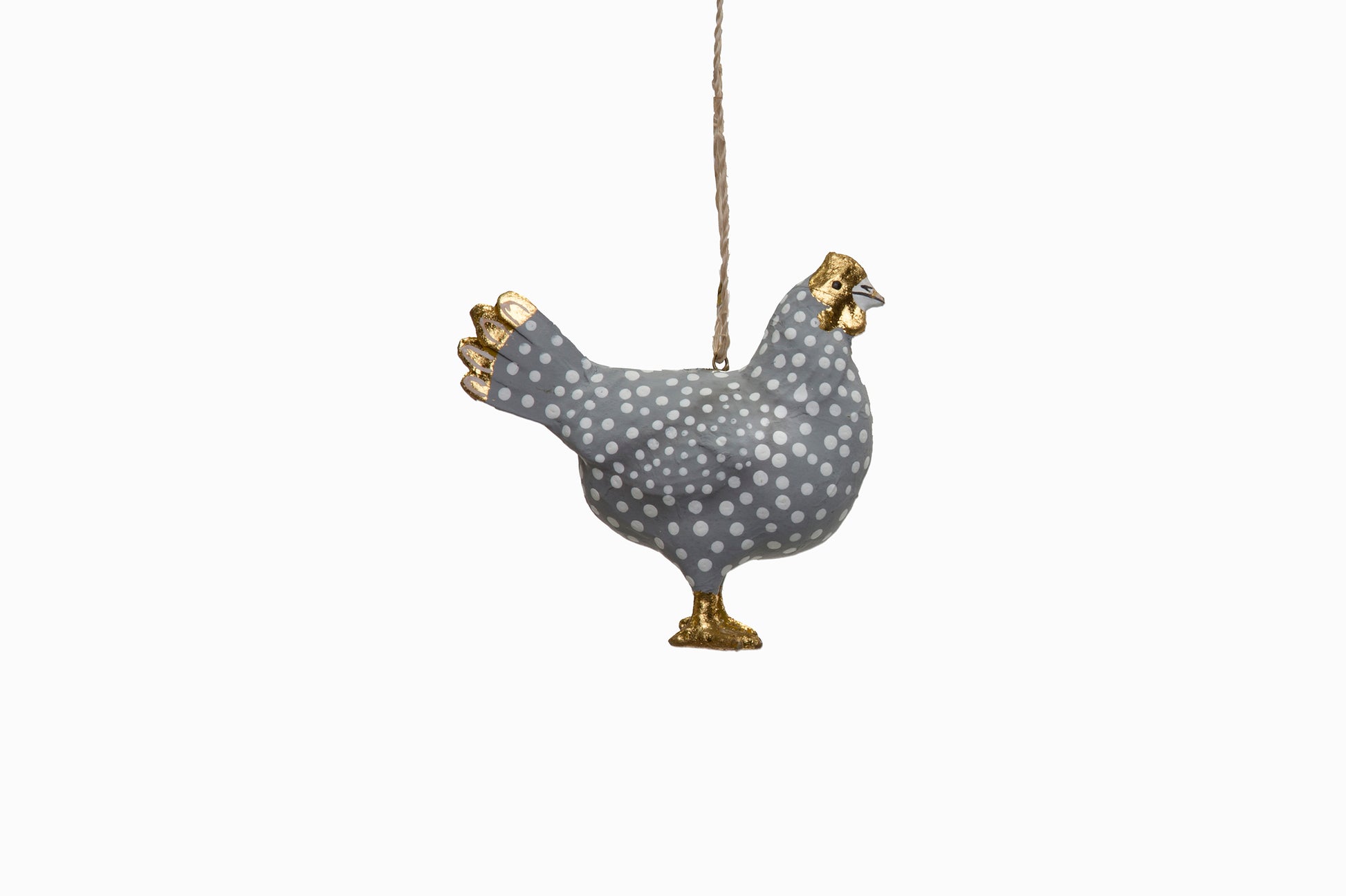 Nuestras gallinas navideñas están moldeadas a mano con papel maché y luego pintadas a mano.