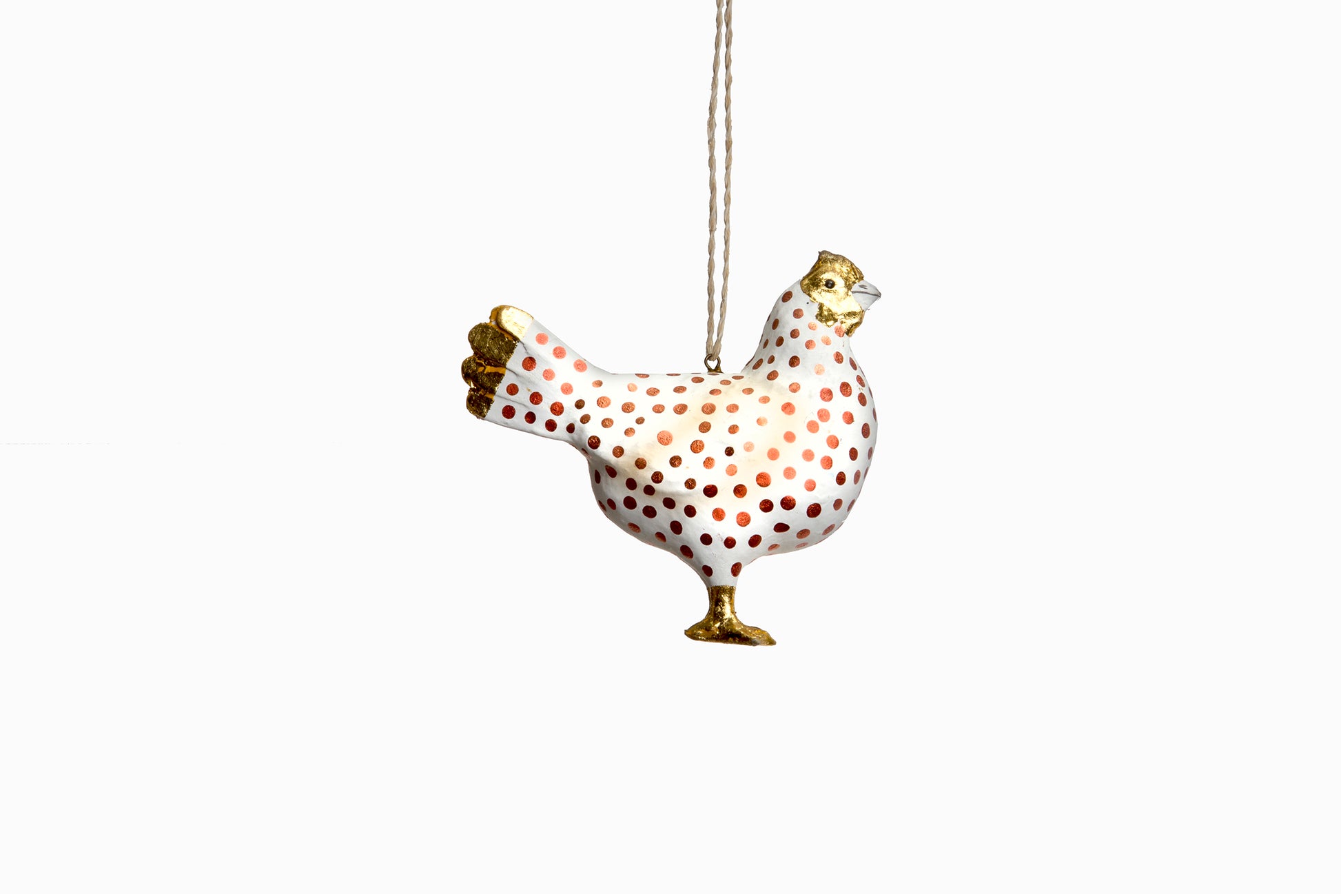 Nuestras gallinas navideñas están moldeadas a mano con papel maché y luego pintadas a mano.