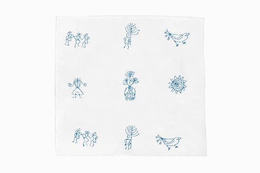SERVIETTES EN COTON BRODÉES ARBRE, OISEAU, SOLEIL ET PERSONNES