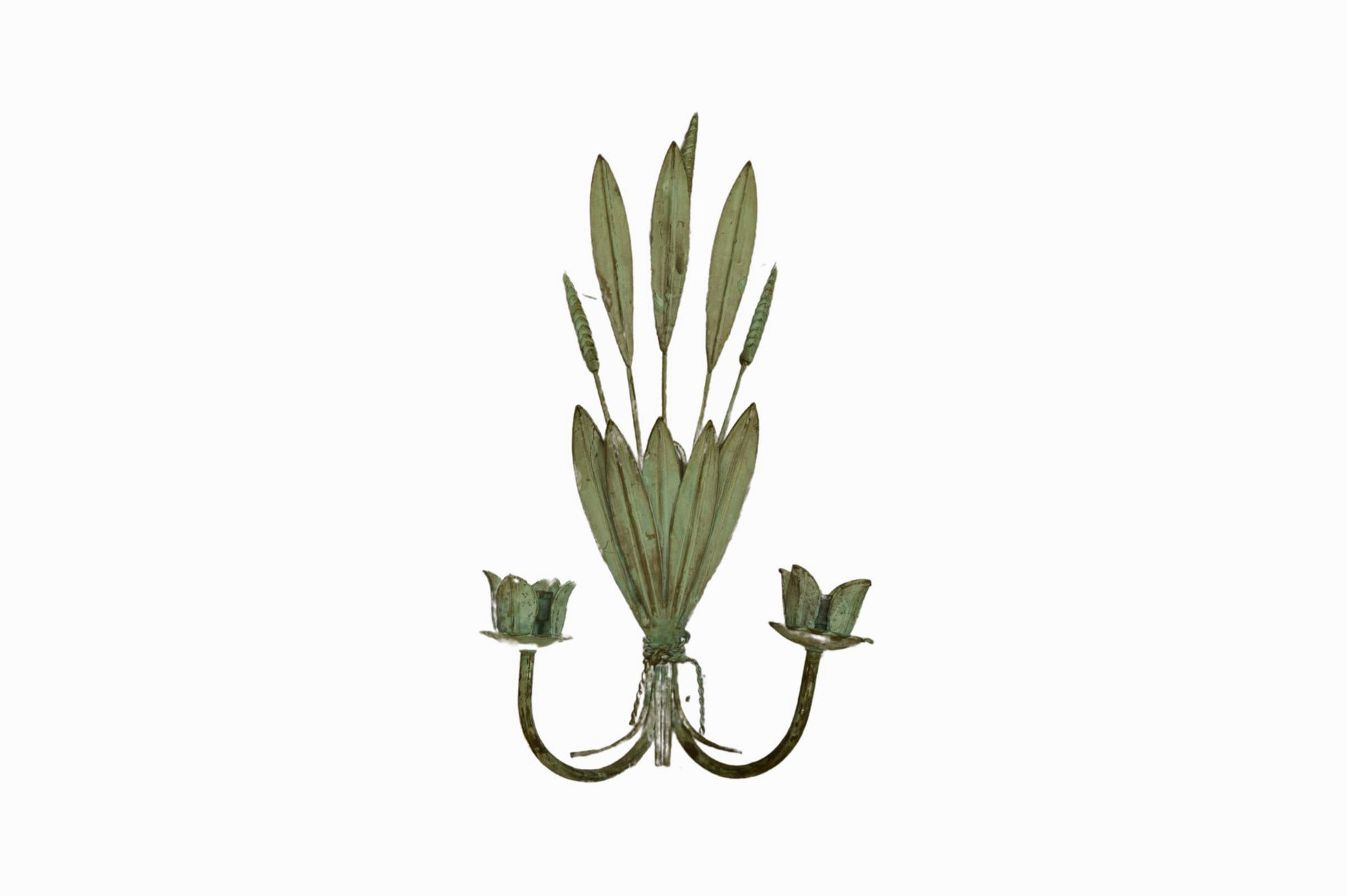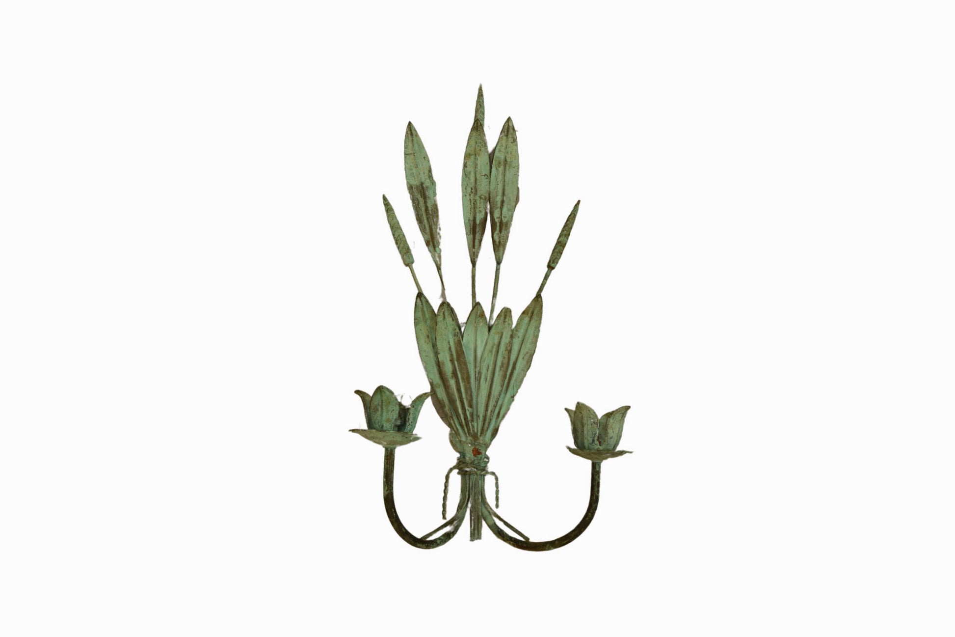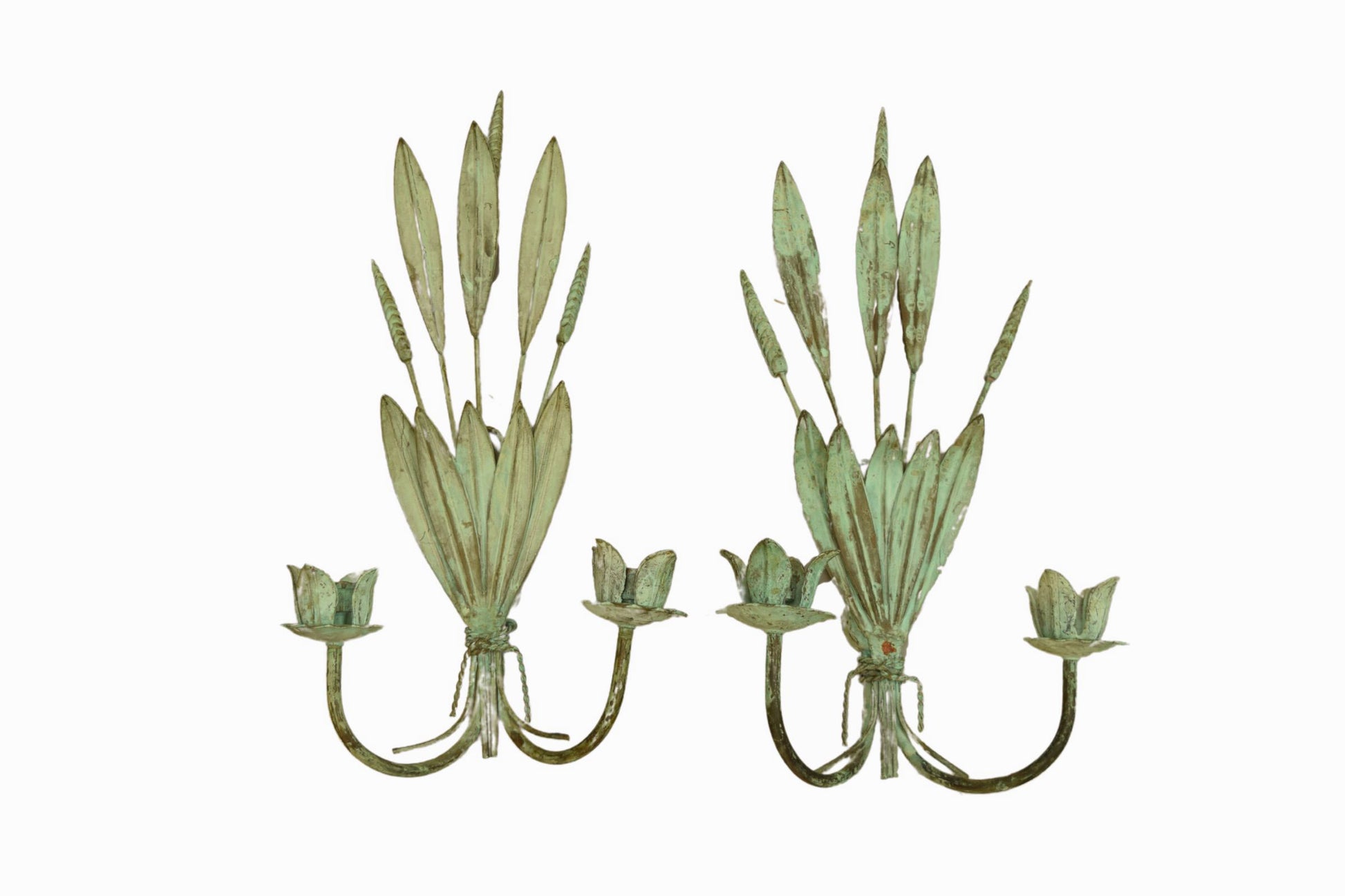 A pair of bronze sconces of stylised wheatsheaves with a verdigris patina. They date from the early to mid 20th century.