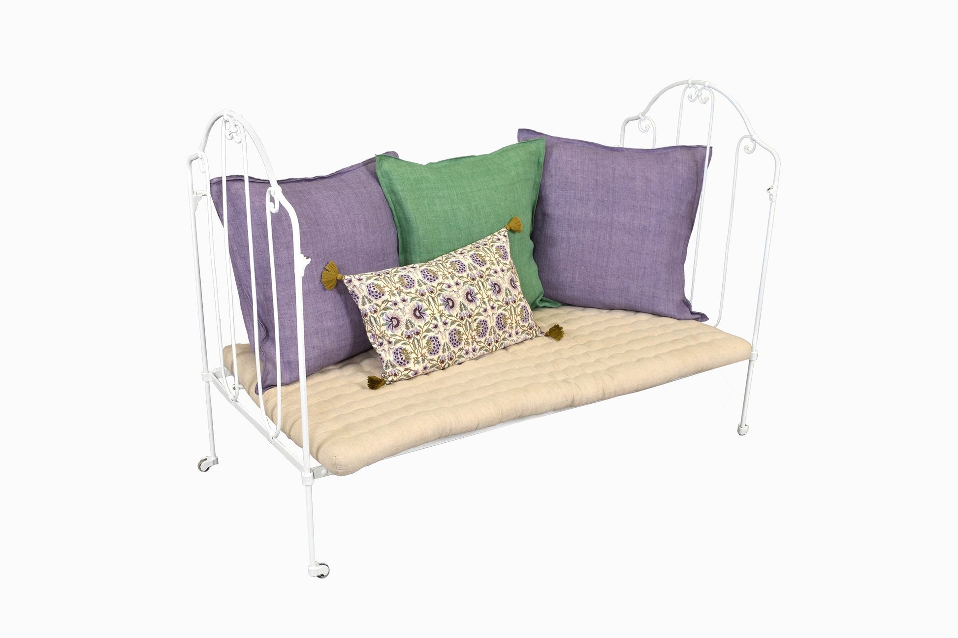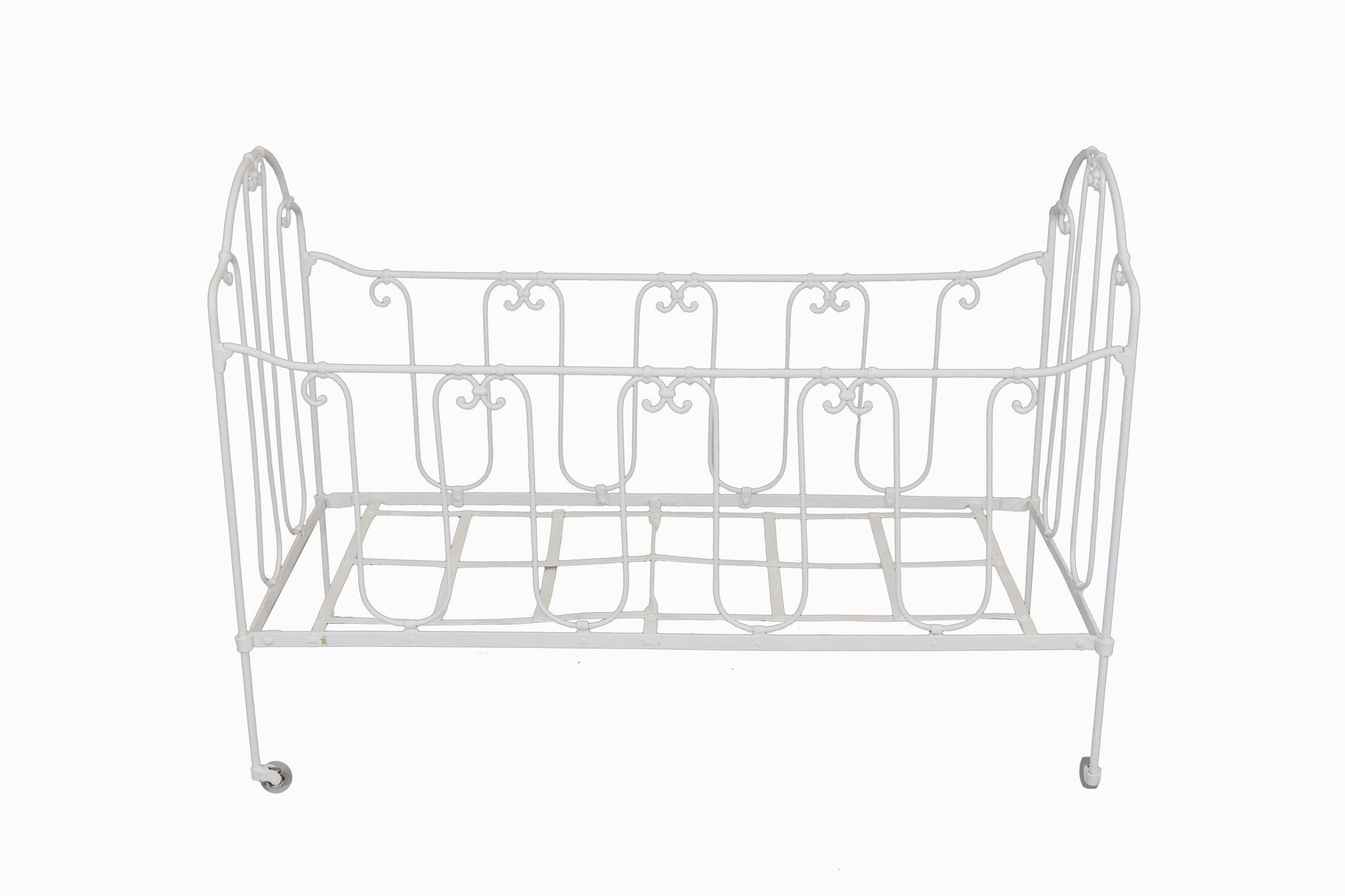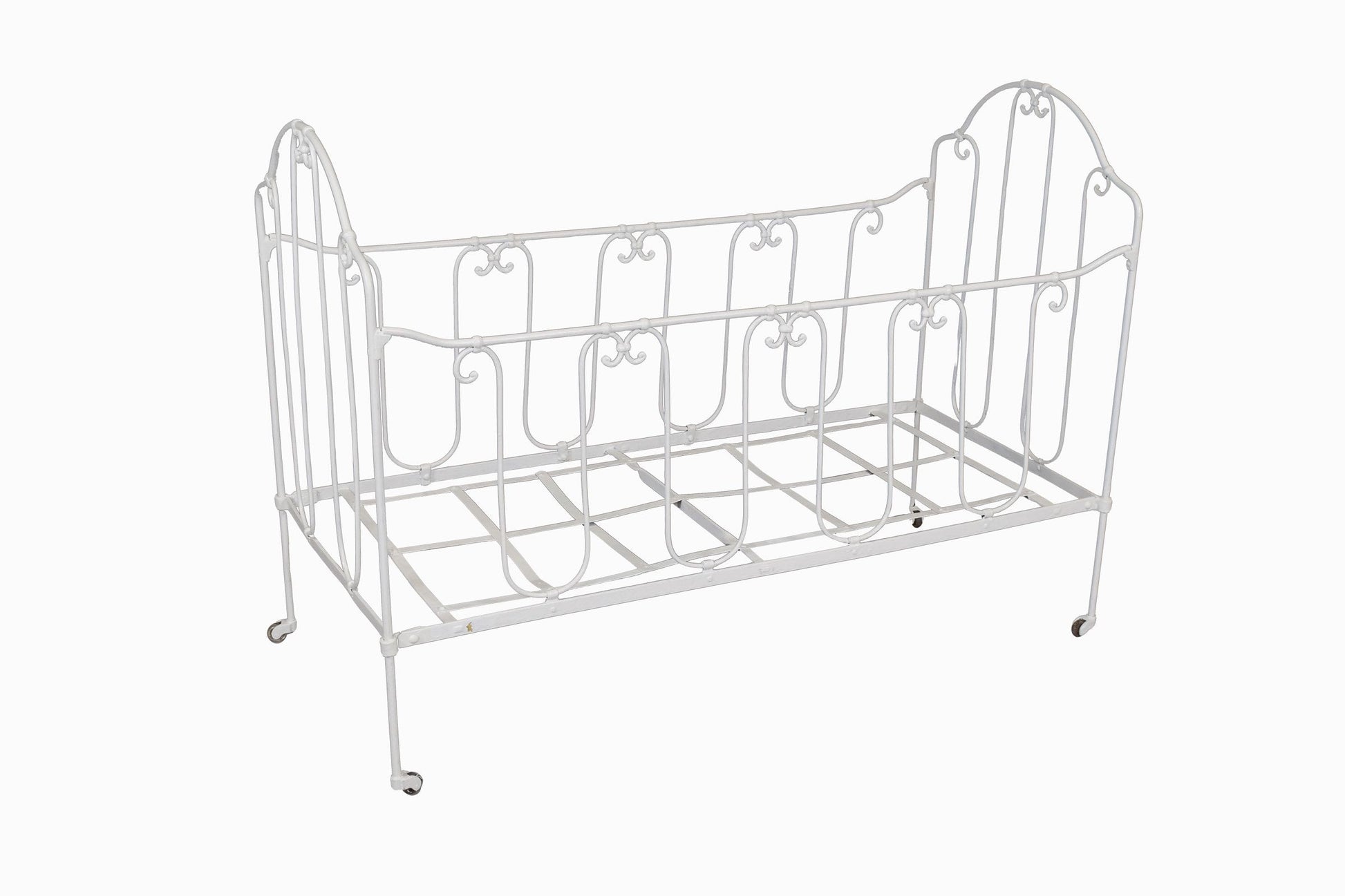 Un lit d'enfant vintage en fer forgé français. L'un des côtés se rabat pour que le lit puisse être utilisé comme siège.