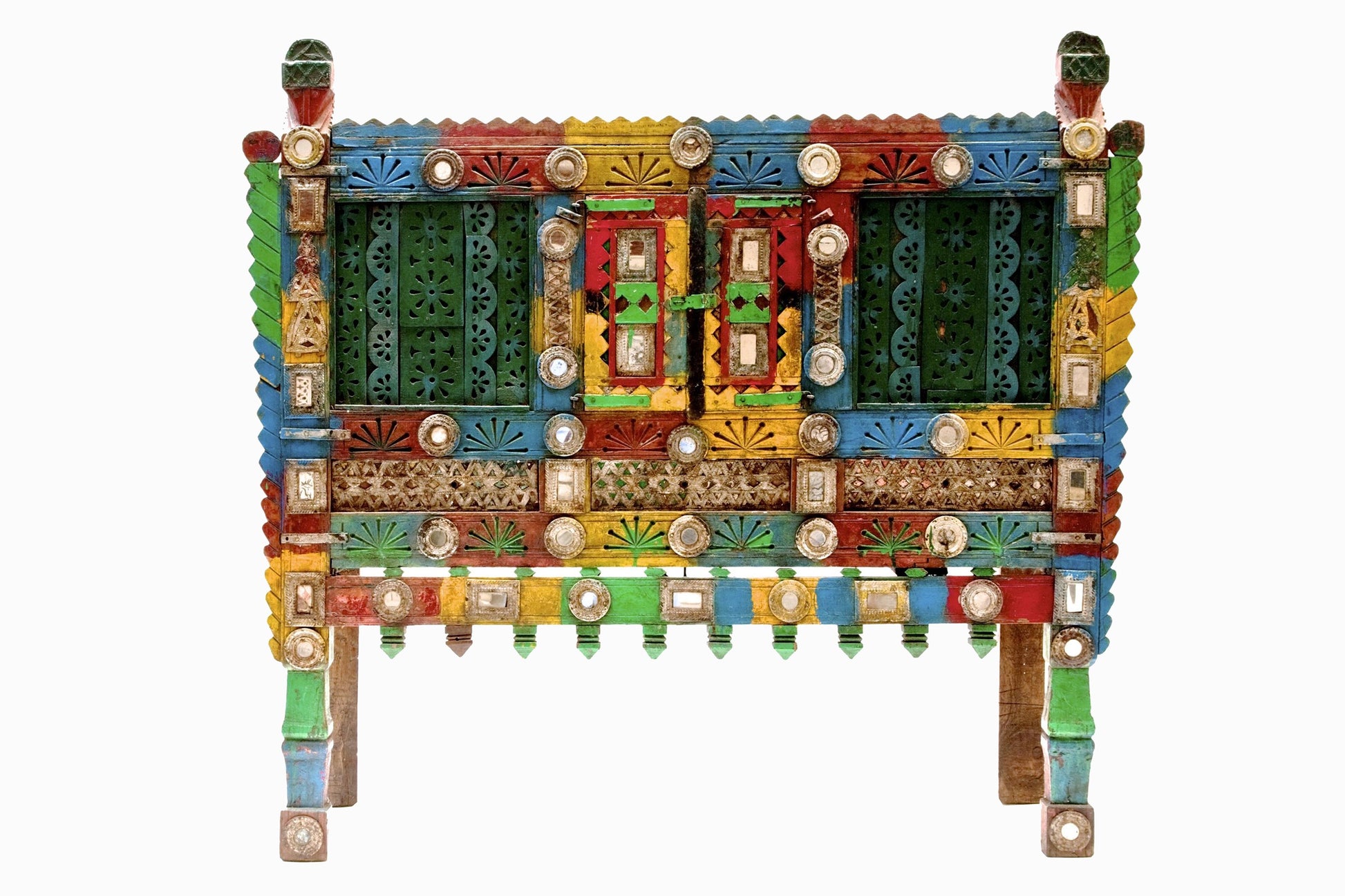 Un coffre de dot en bois peint du début du XXe siècle, provenant du Gujarat ou du Rajasthan.