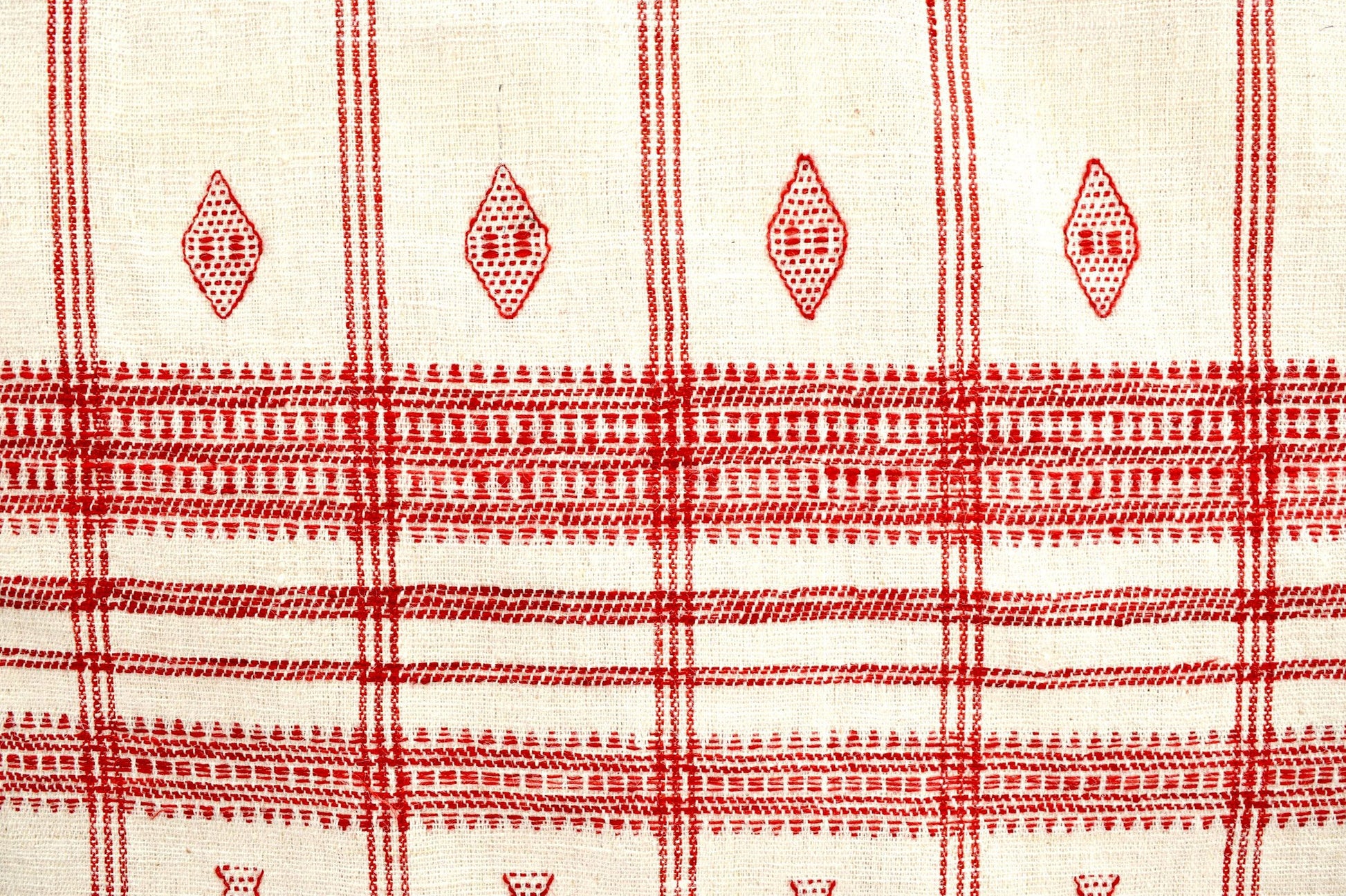 Un grand et somptueux couvre-lit en laine tissé à la main avec un motif crème et rouge du nord de l'Inde. S'adapte facilement à un lit super king-size.