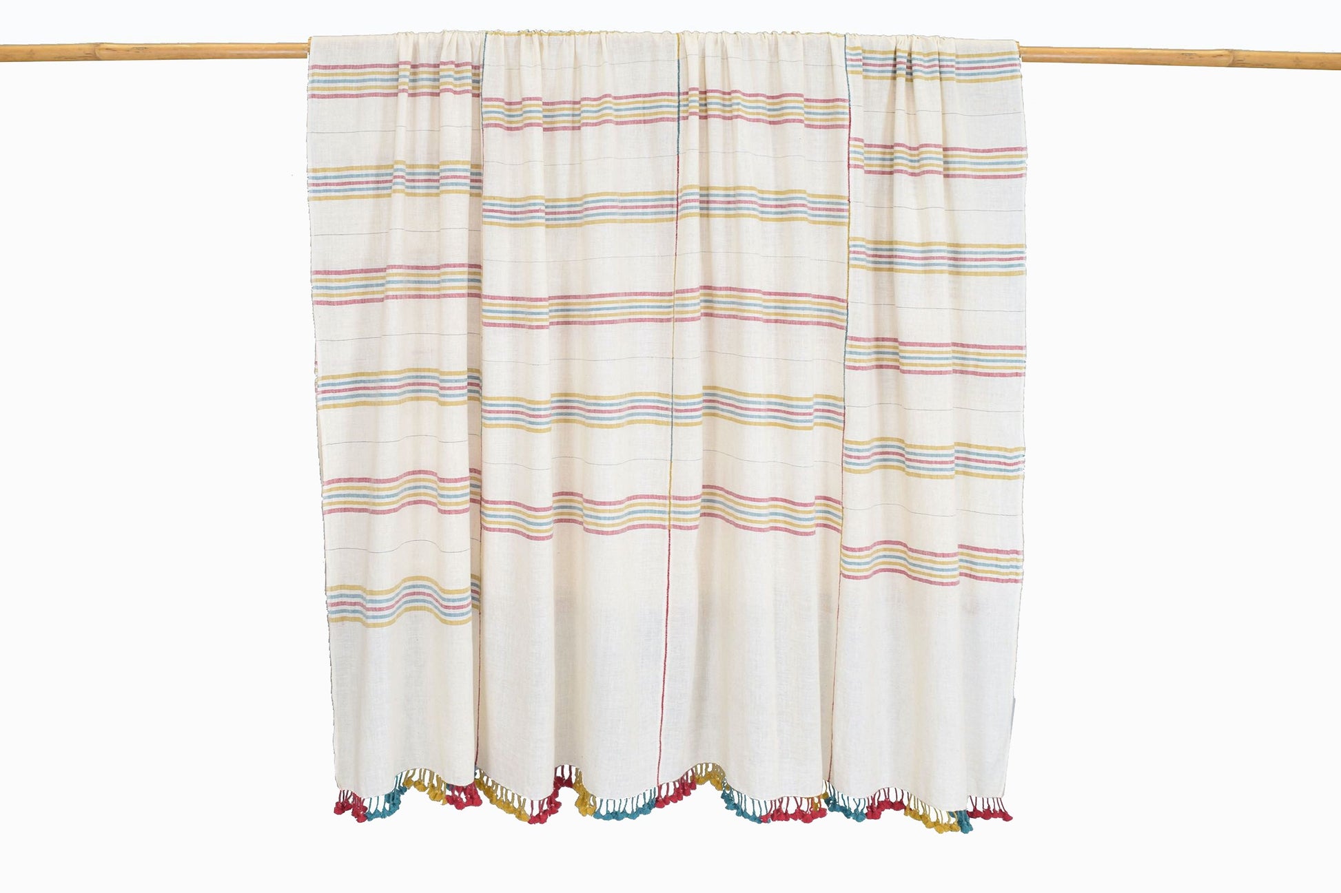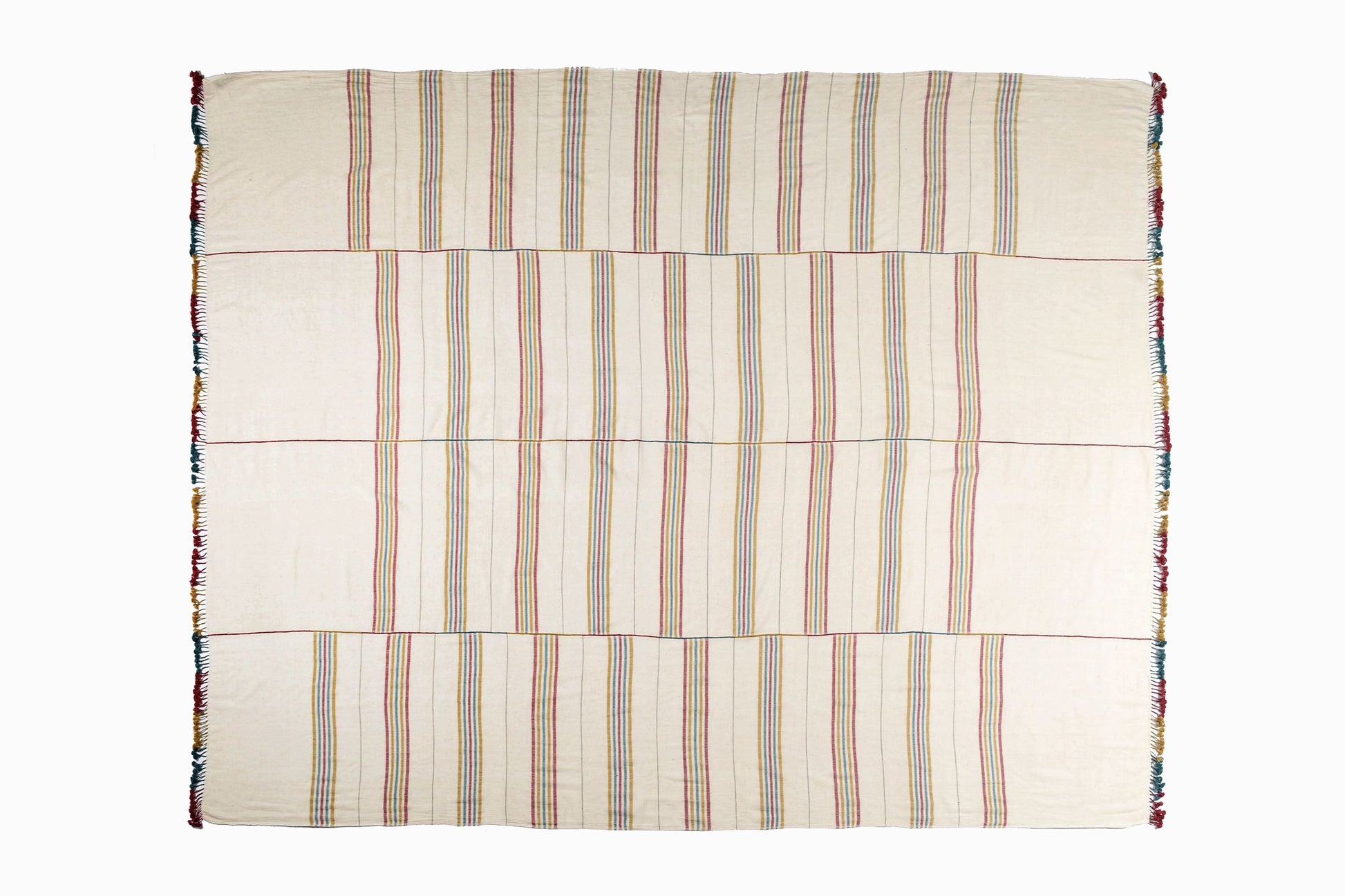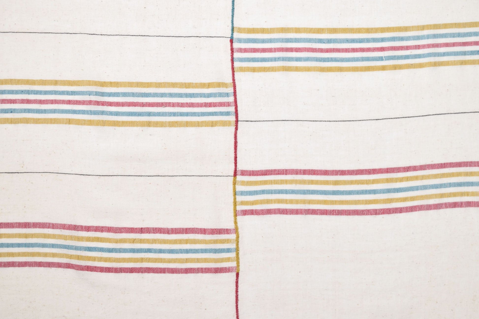 Un magnifique couvre-lit contemporain en coton crème à rayures rouges, jaune moutarde et bleues. Il a été tissé à la main à Bhuj, Gujurat, dans l'ouest des Indes, par une coopérative primée.
