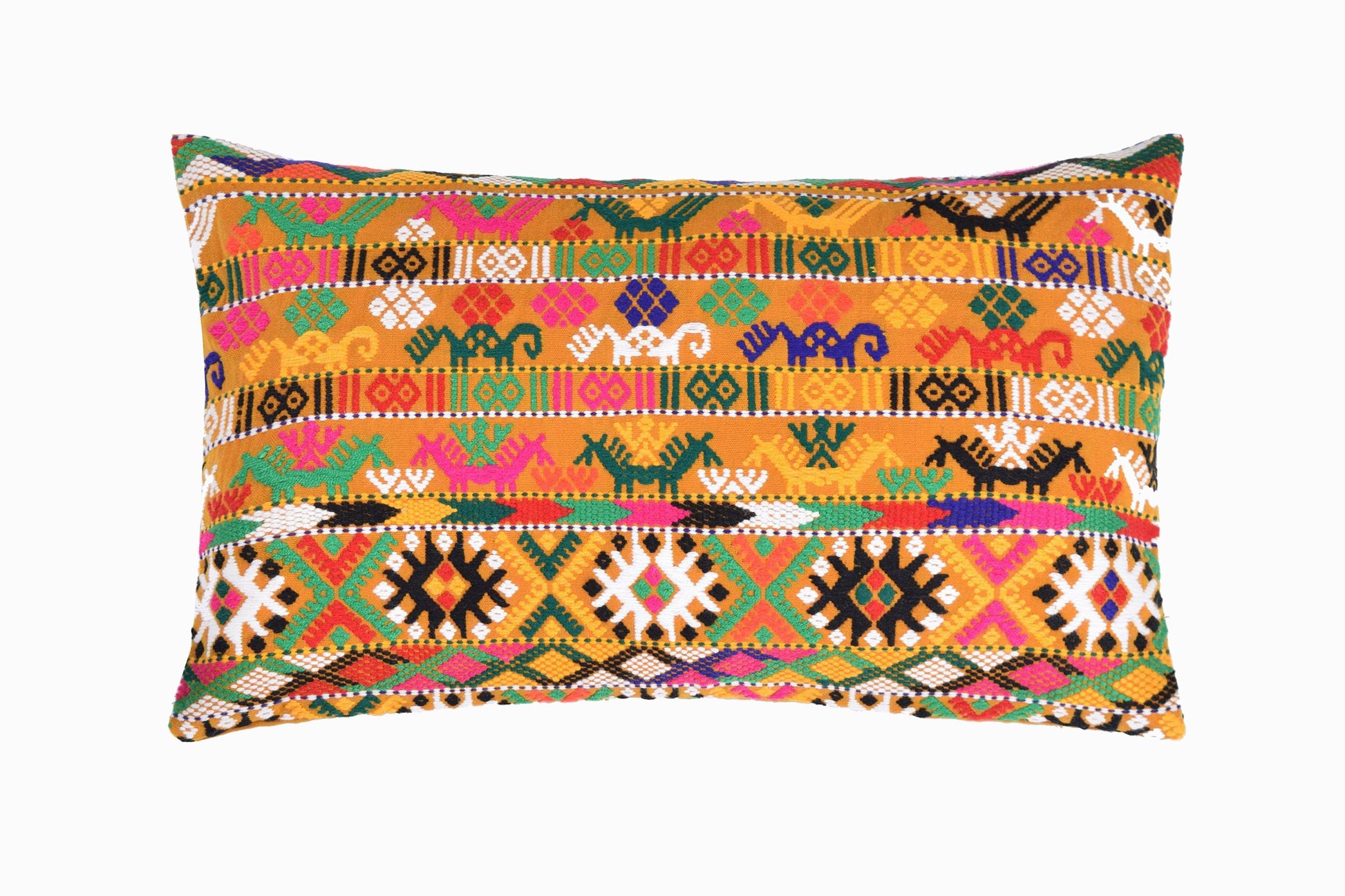 Un coussin en coton aux couleurs vives brodé à la main sur une base en coton moutarde dorée. Le dos est brodé d'un motif différent.