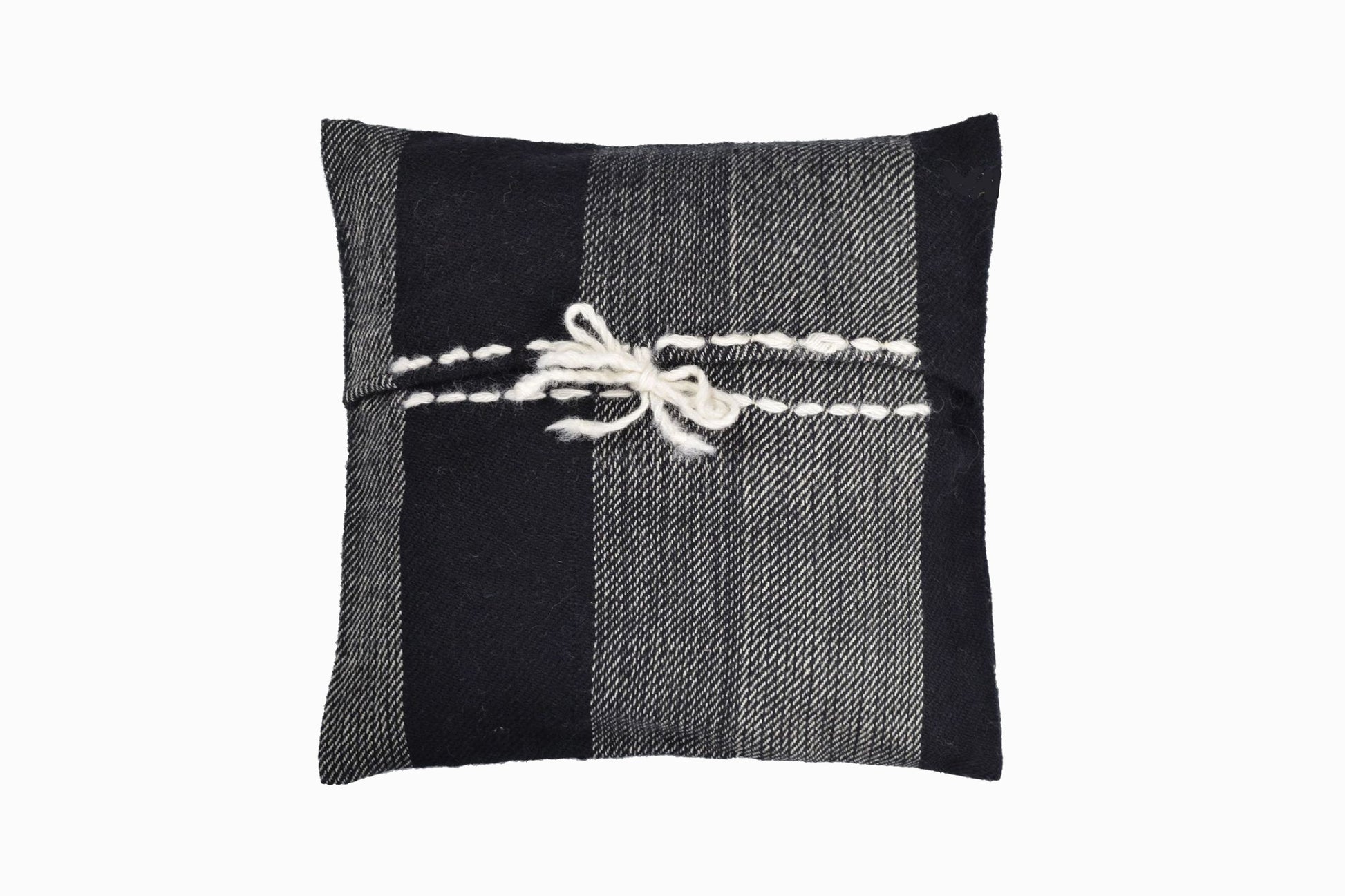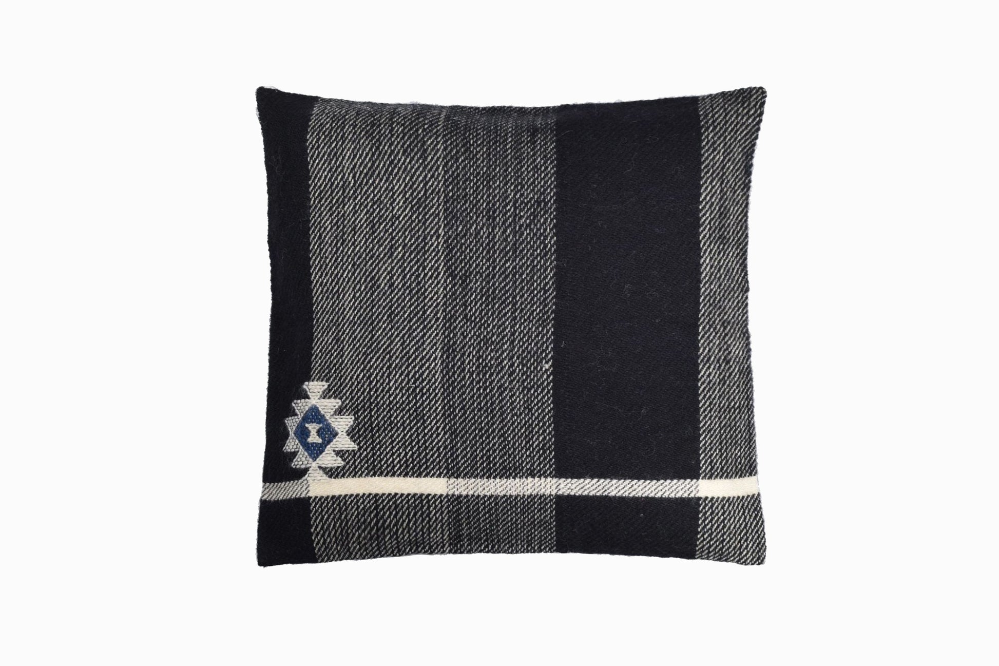 Un coussin en laine himalayenne tissé à la main de haute qualité avec un superbe design noir crème et bleu du Royaume du Bhoutan. Il s'agit d'un produit du commerce équitable.