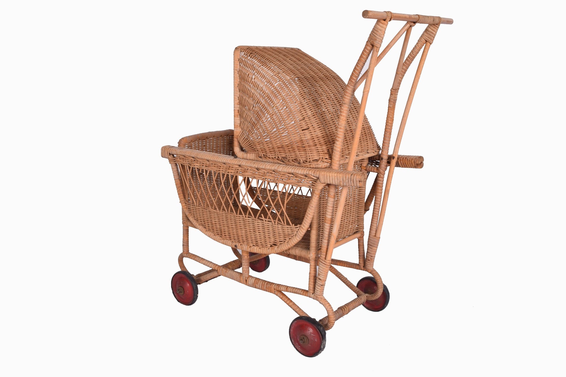 Landau jouet en rotin vintage pour enfant. La capote du landau pivote pour pouvoir être repositionnée comme illustré.