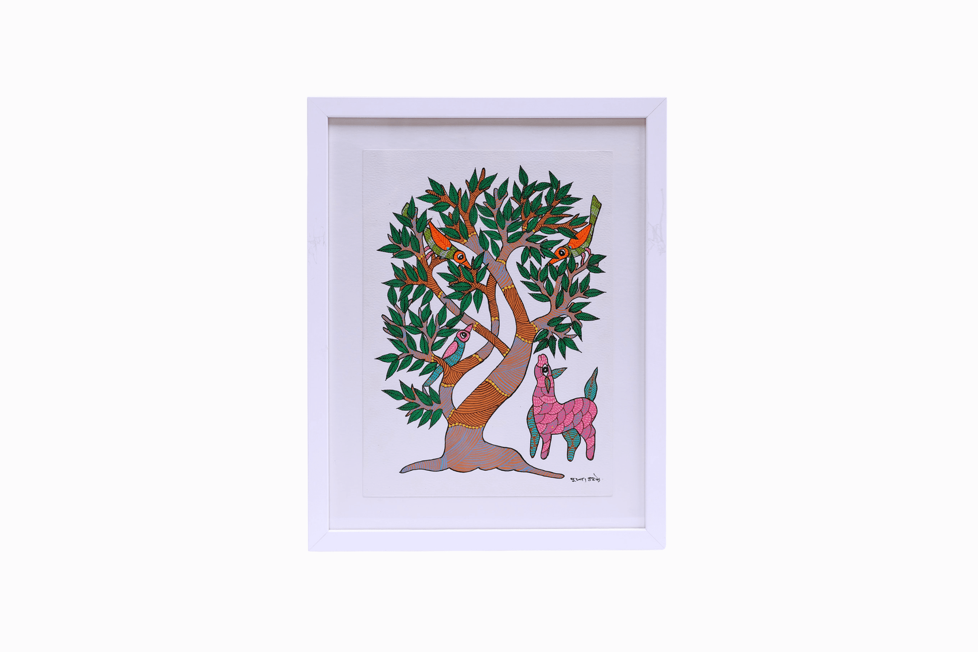 Élevé dans l'État du Madya Pradesh, au centre de l'Inde, Dilip Shyam est un artiste célèbre pour ses représentations de la nature dans le style de l'art Gond.