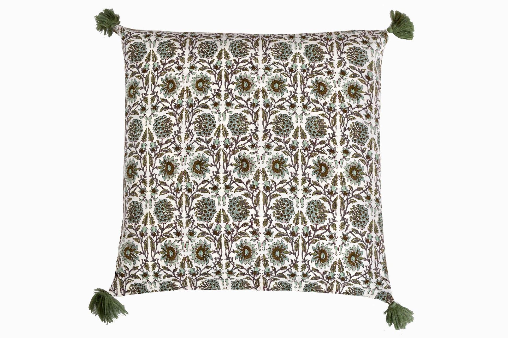Un joli coussin carré en coton avec un imprimé floral fait à la main et des pompons dans les coins.