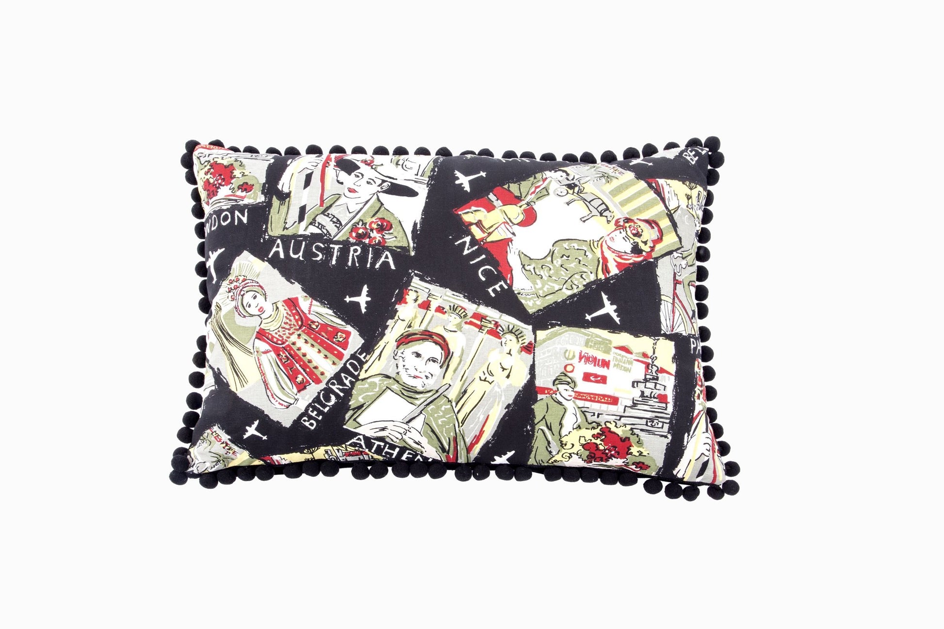 Ces housses de coussin sont réalisées en coton imprimé dans les années 50 ou 60 avec un motif intégrant diverses villes européennes. Vous pouvez voyager à travers le continent dans le confort de votre fauteuil !