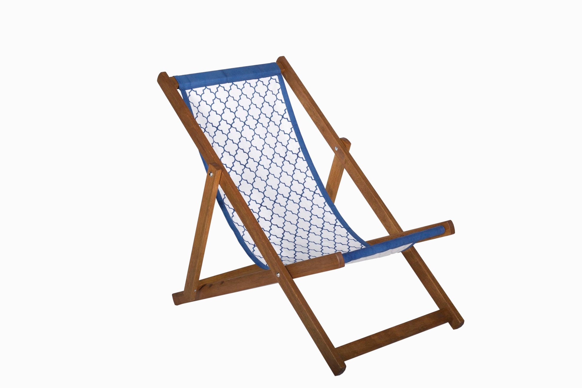 Cette chaise longue élégante est livrée avec une toile 100 % coton, imprimée à la main en Inde, sur un cadre en bois dur FSC.