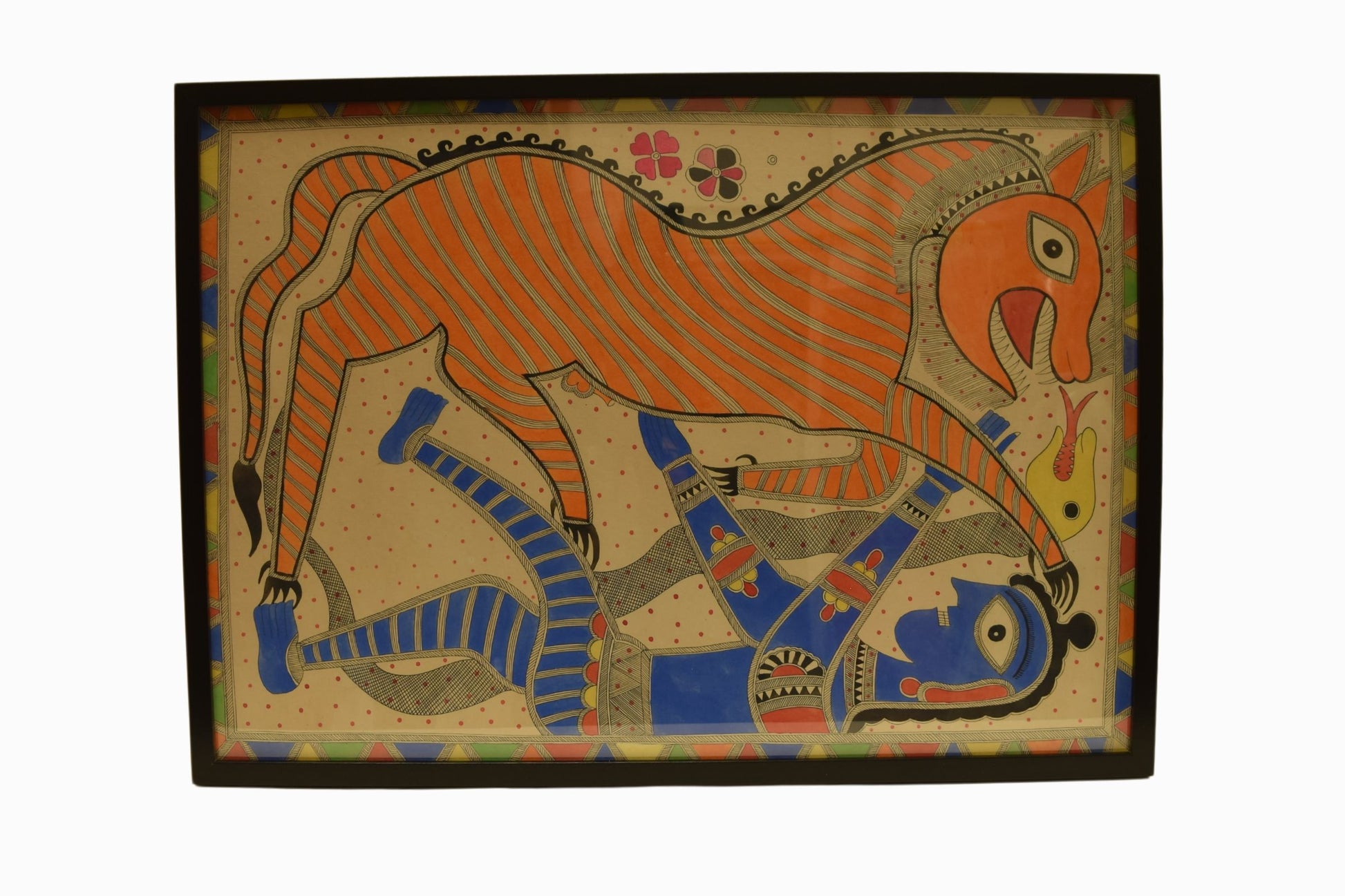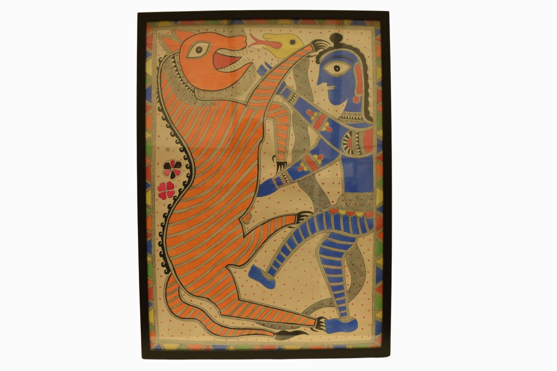 A Madhubani painting on paper of Vishnu at battle with monsters.