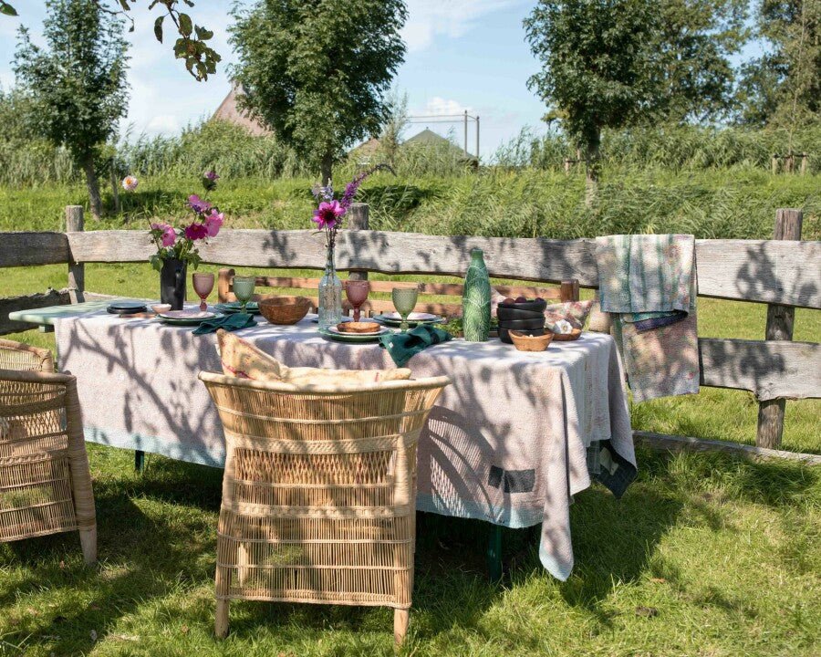 The cane reeds and wooden frame aren’t treated and might darken when wet. We advise inside storage during inclement weather unless you prefer the dark grey teak look.