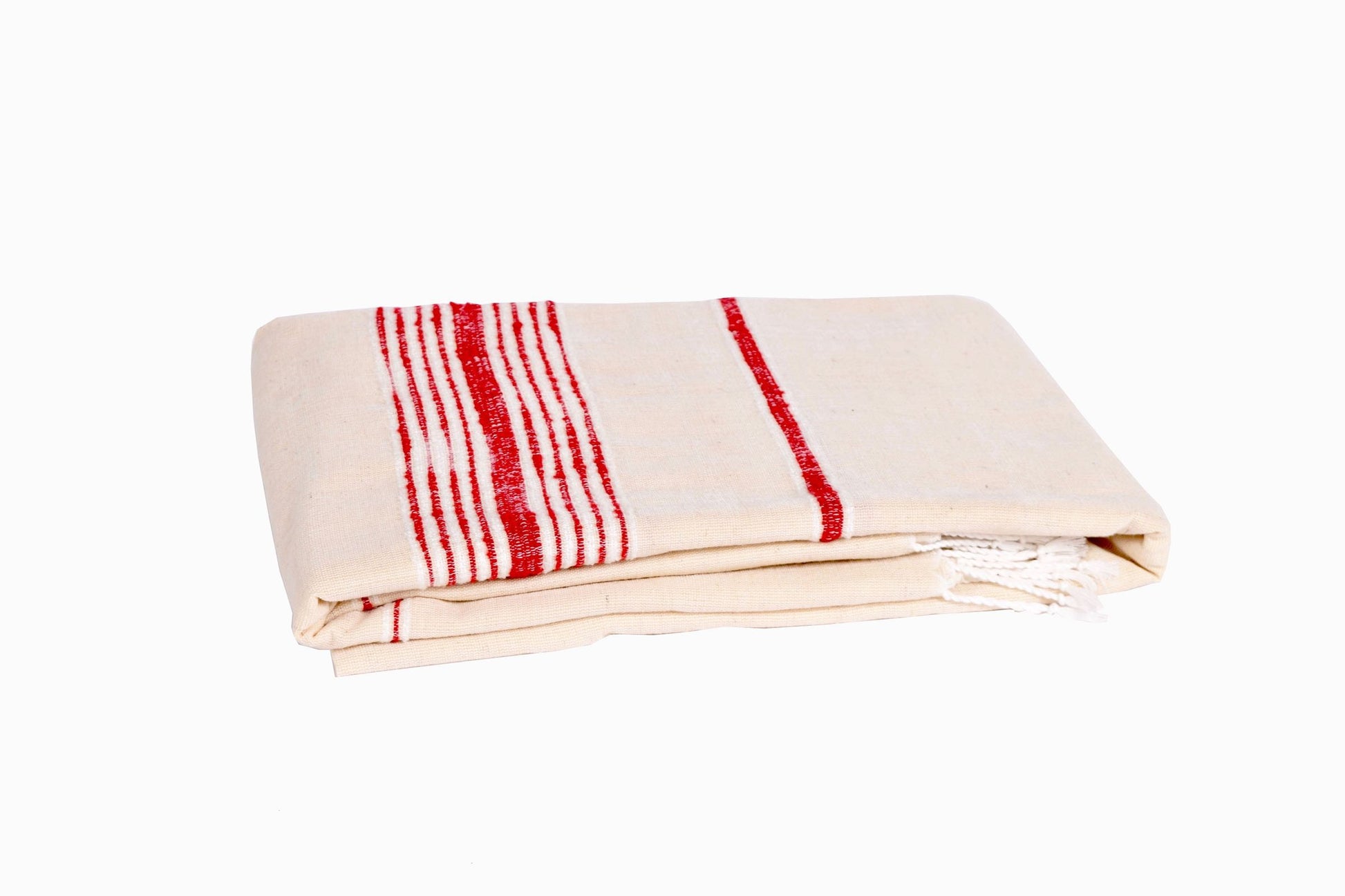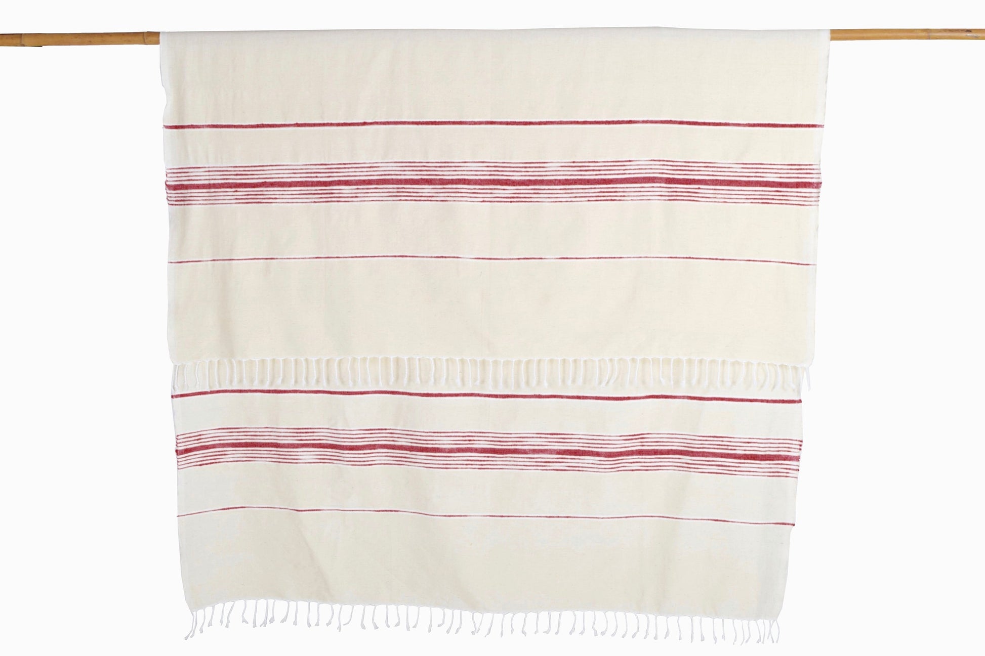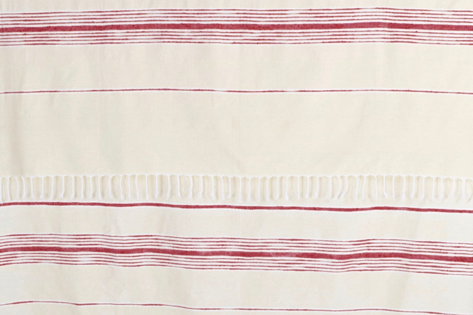 Un couvre-lit en laine crème tissé à la main avec des rayures rouges et des pompons du nord du Maroc.