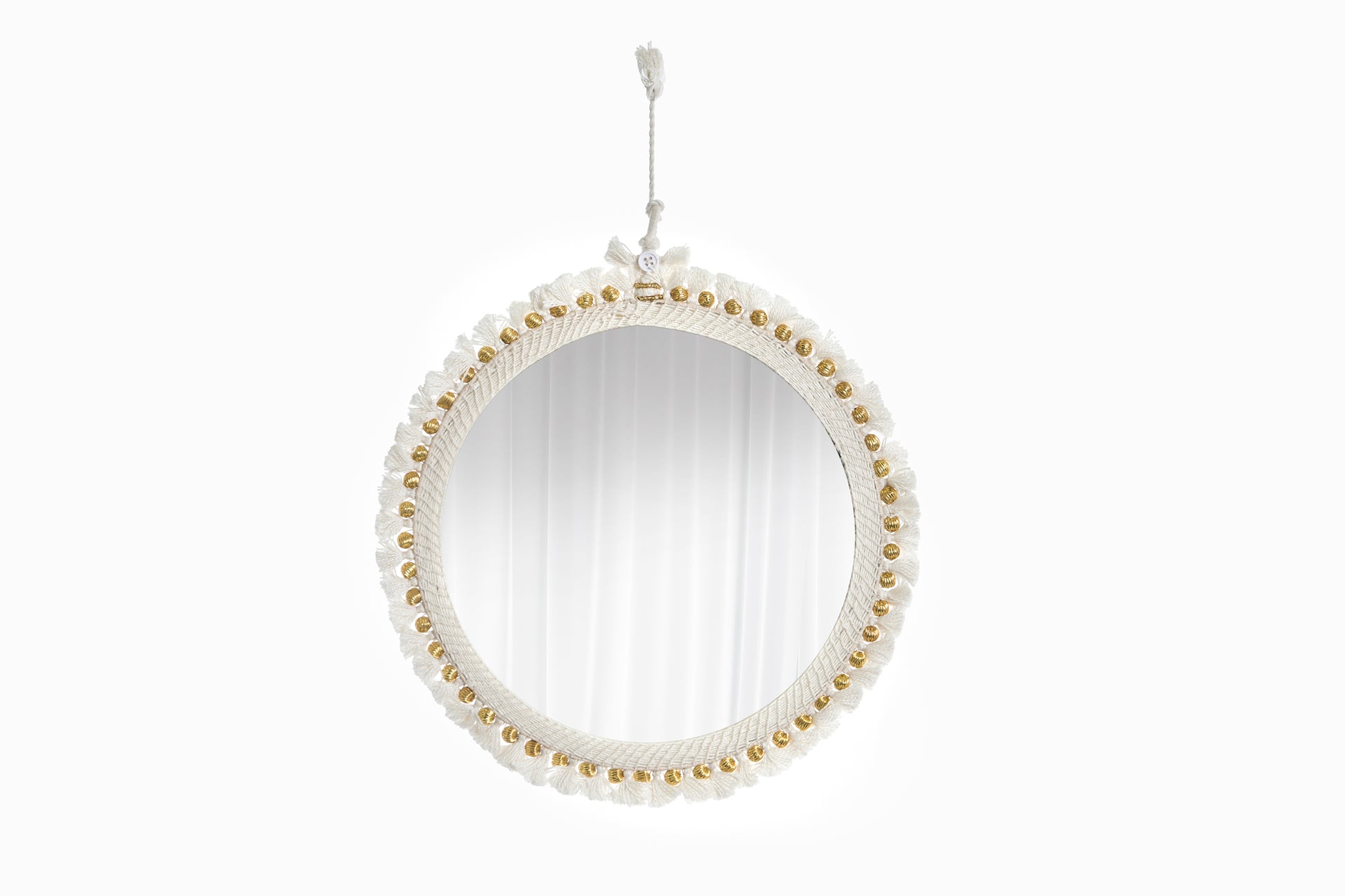 Miroirs ronds dans un cadre en coton blanc cassé avec des perles dorées et des pompons blanc cassé sur le pourtour.