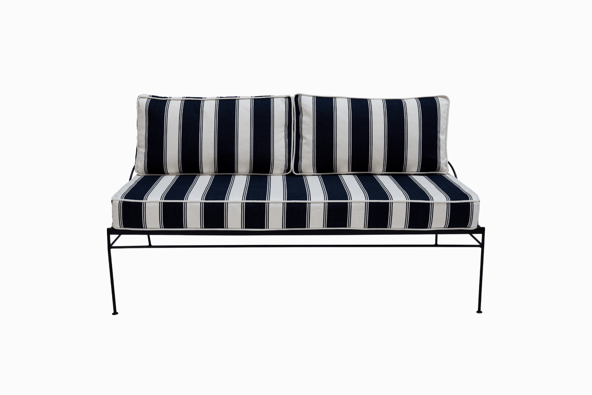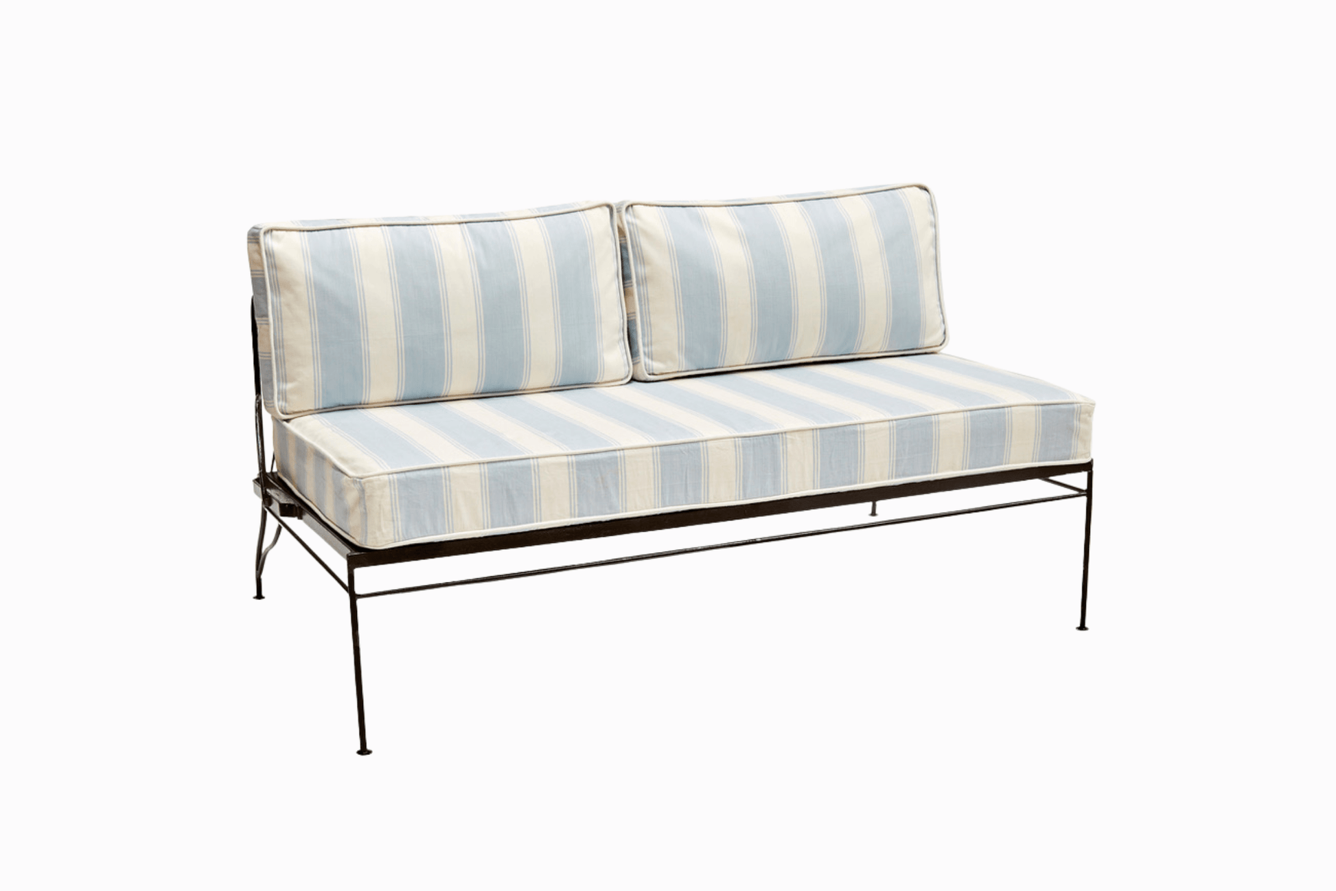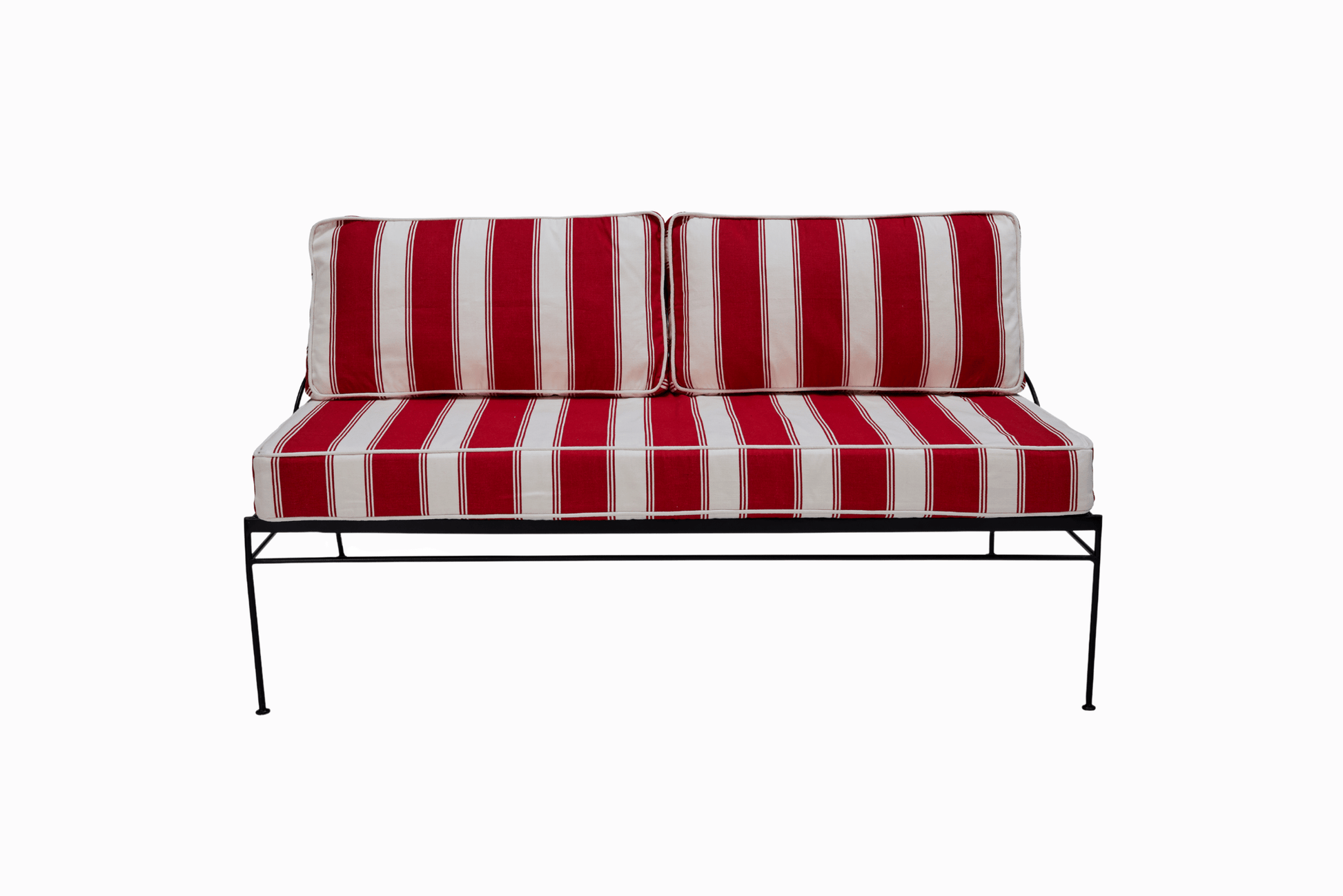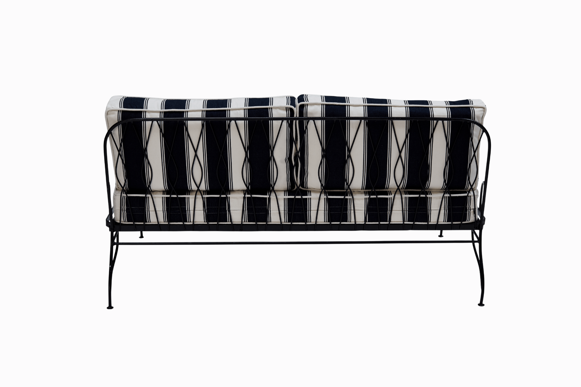 Our Palm Springs Sofa is ideal for indoor or conservatory use. It can be used outdoors as the metal frame is finished in durable gunmetal powder coating. However, the cushions and covers should not be left out in the rain.