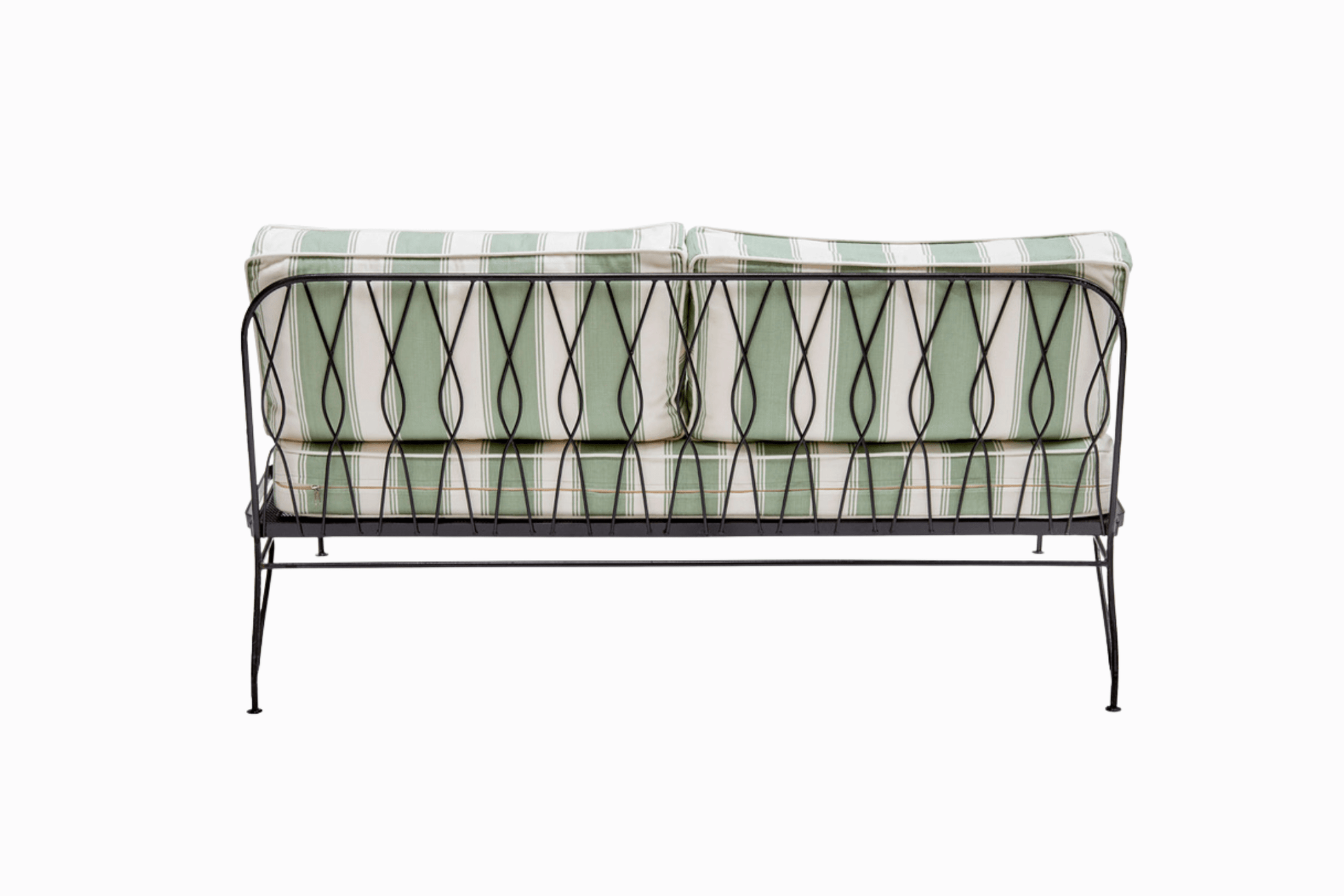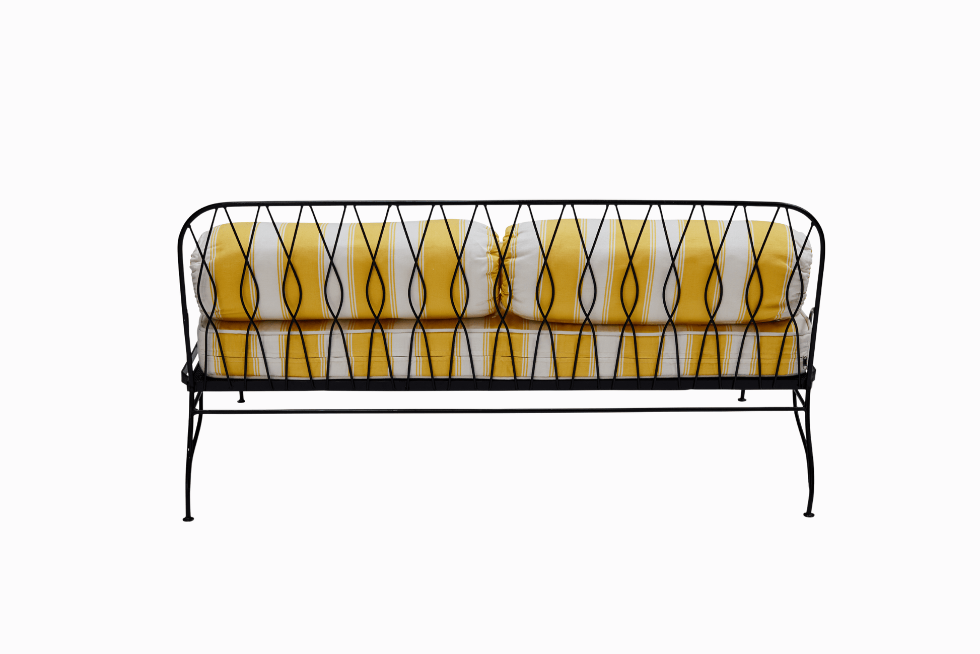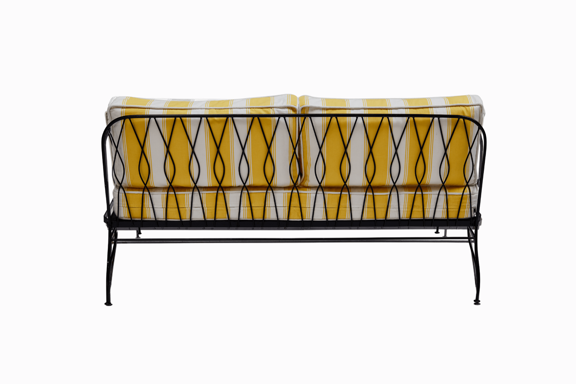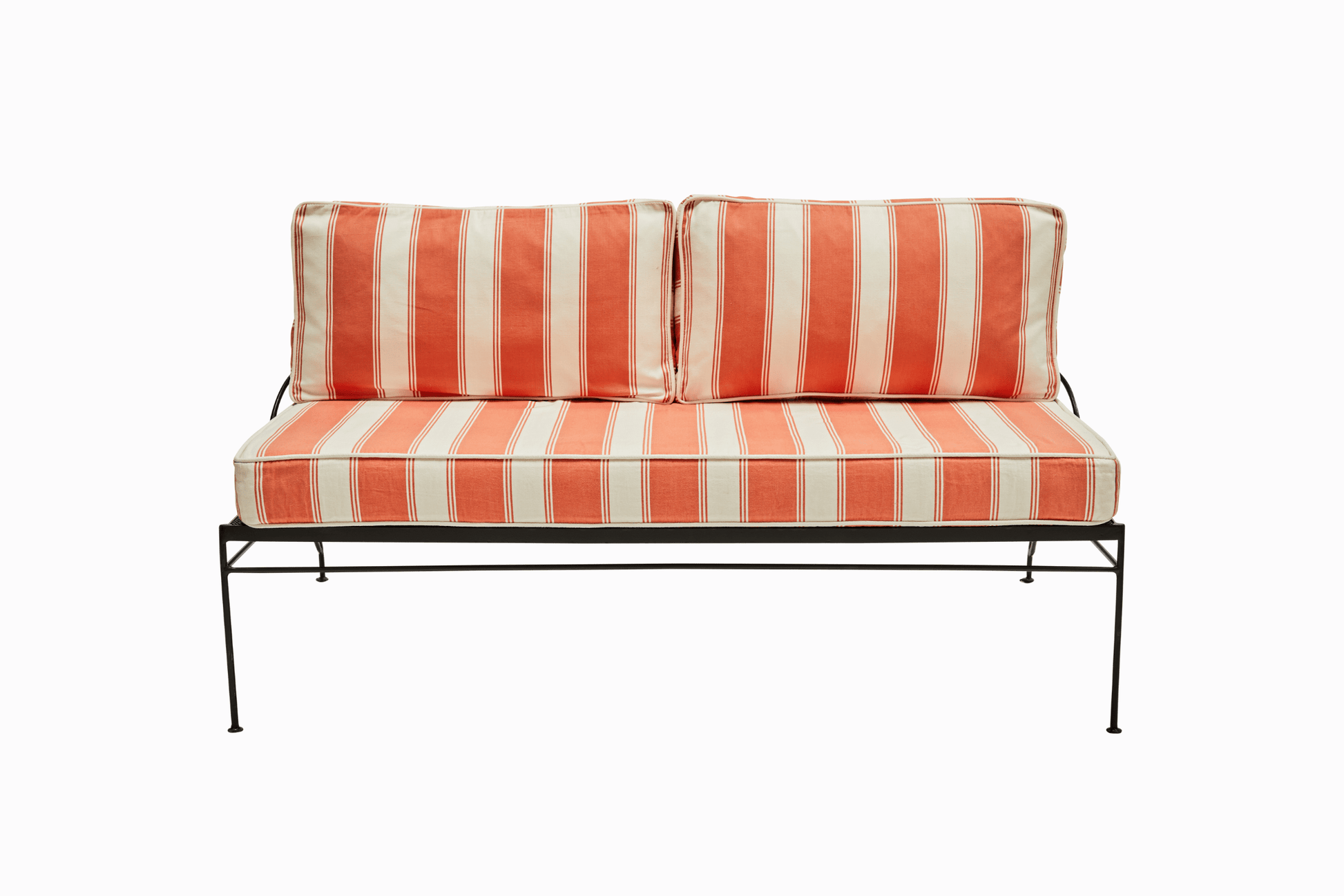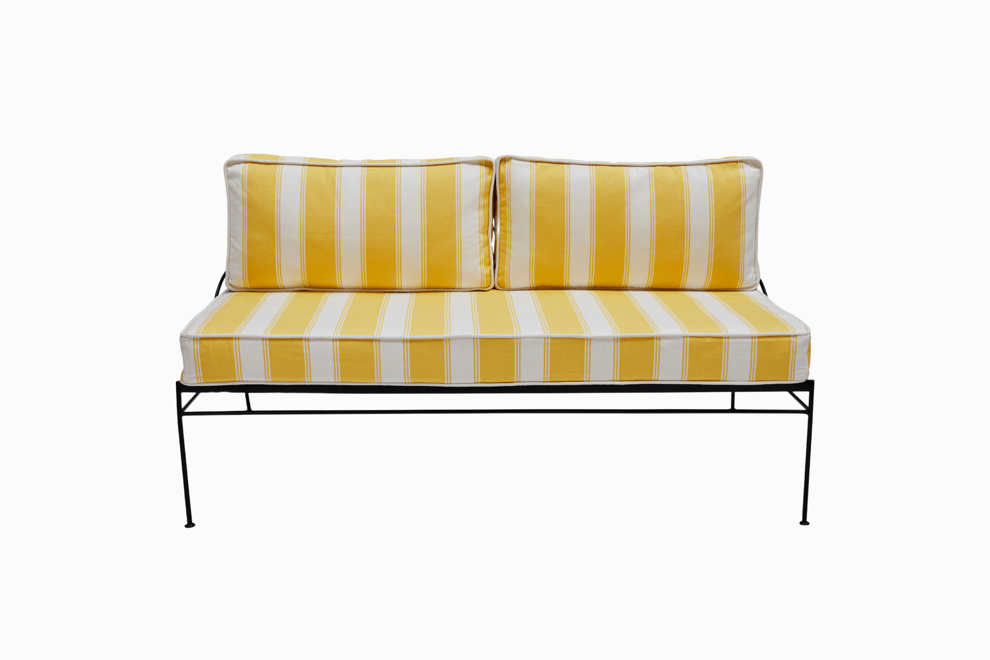 Our Palm Springs Sofa is ideal for indoor or conservatory use. It can be used outdoors as the metal frame is finished in durable gunmetal powder coating. However, the cushions and covers should not be left out in the rain.
