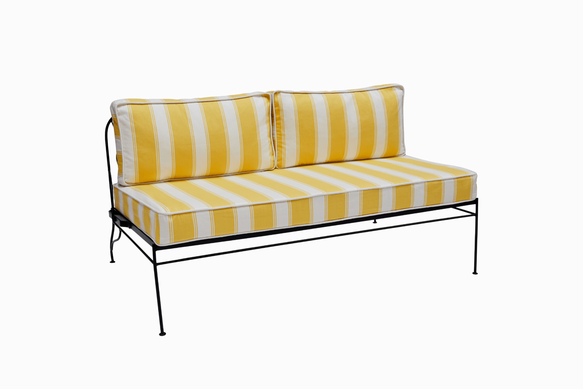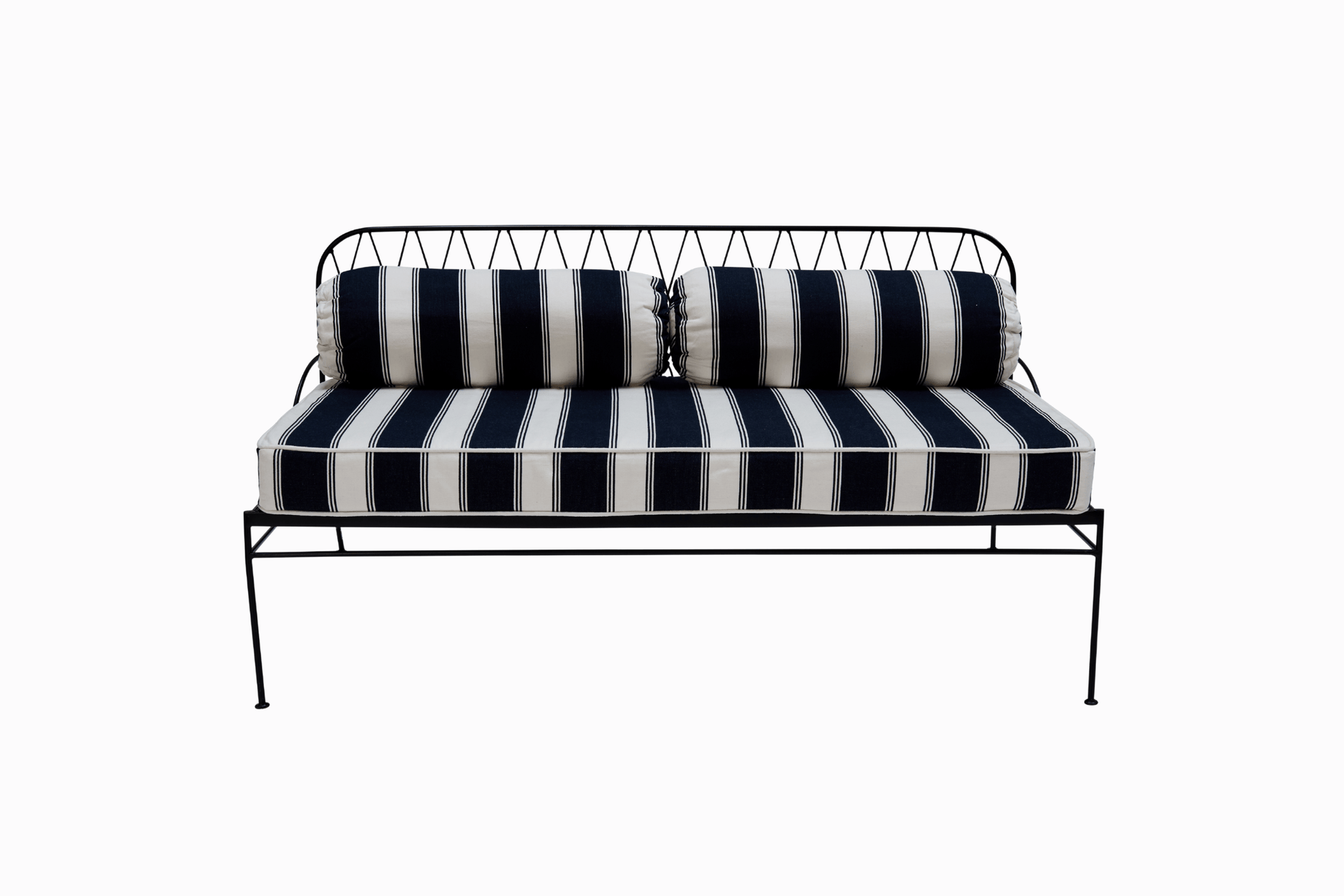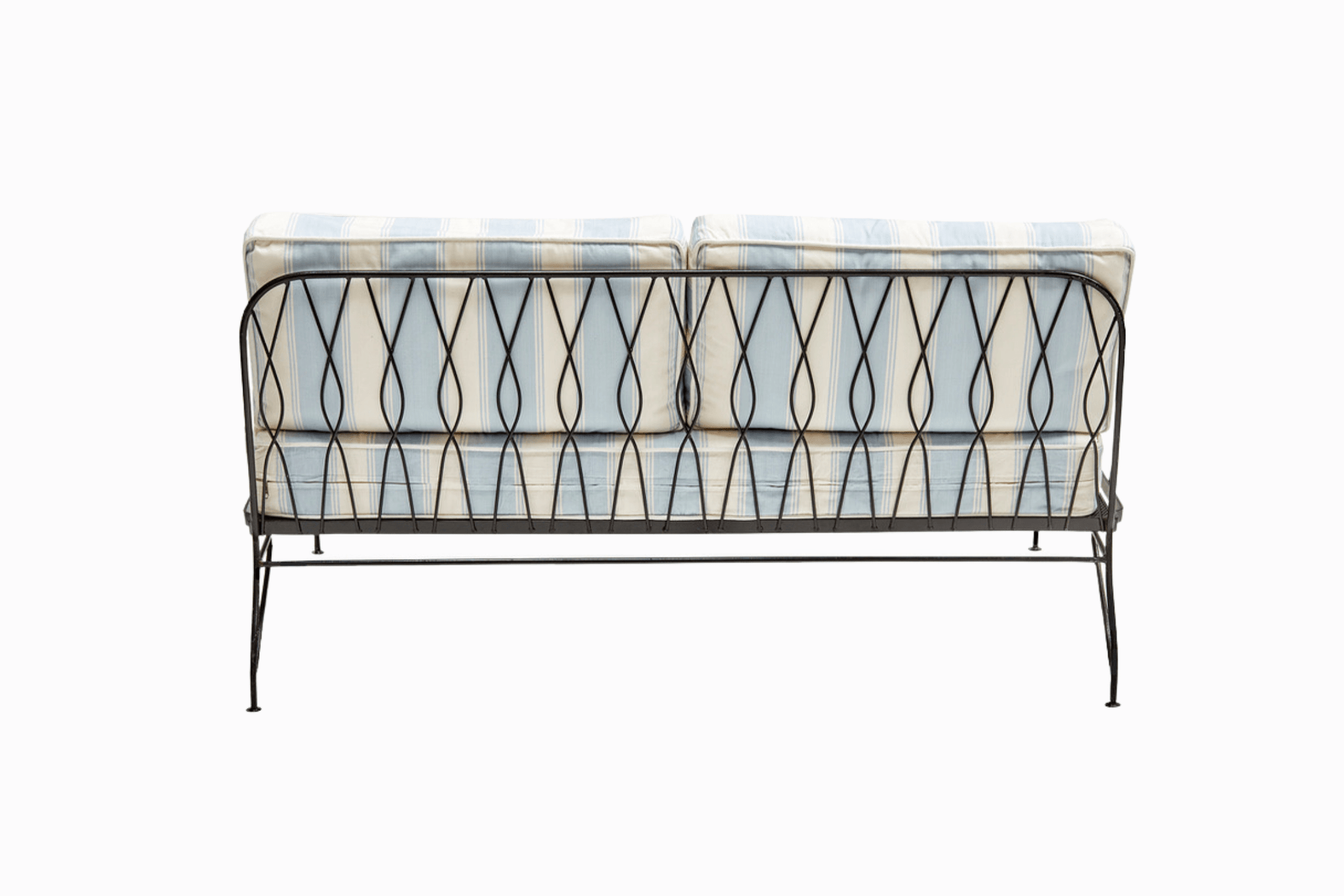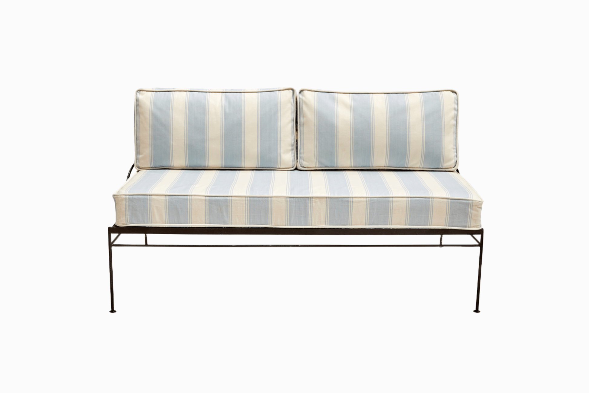 Our Palm Springs Sofa is ideal for indoor or conservatory use. It can be used outdoors as the metal frame is finished in durable gunmetal powder coating. However, the cushions and covers should not be left out in the rain.