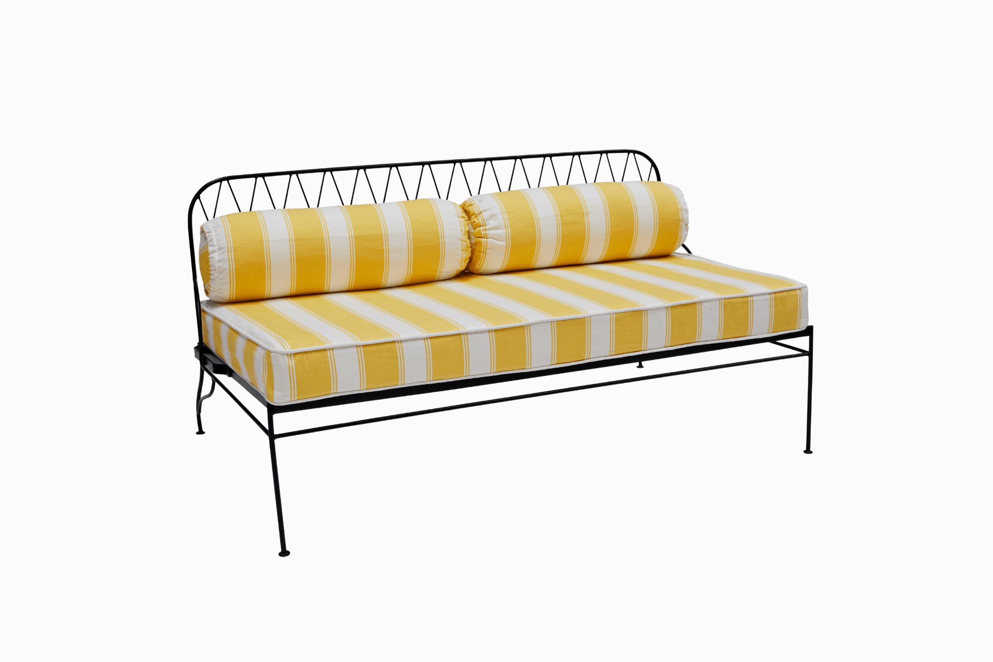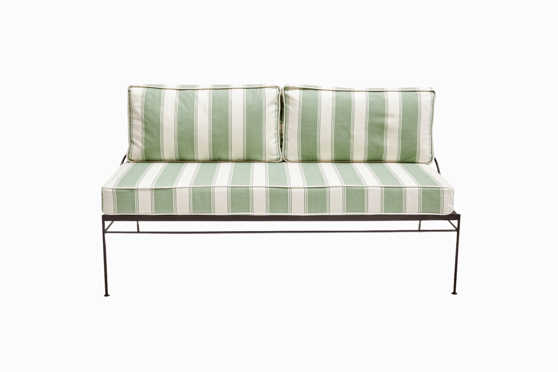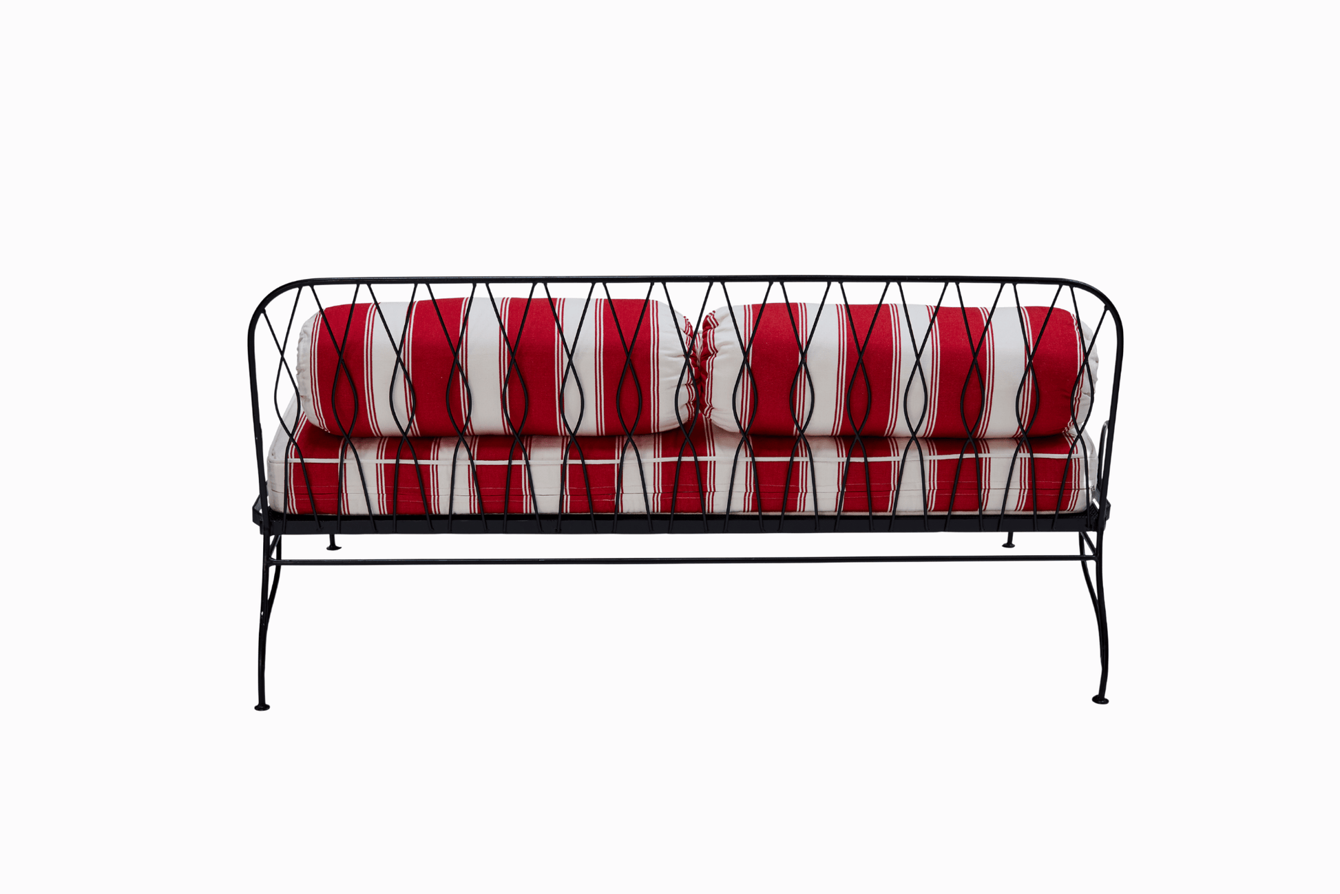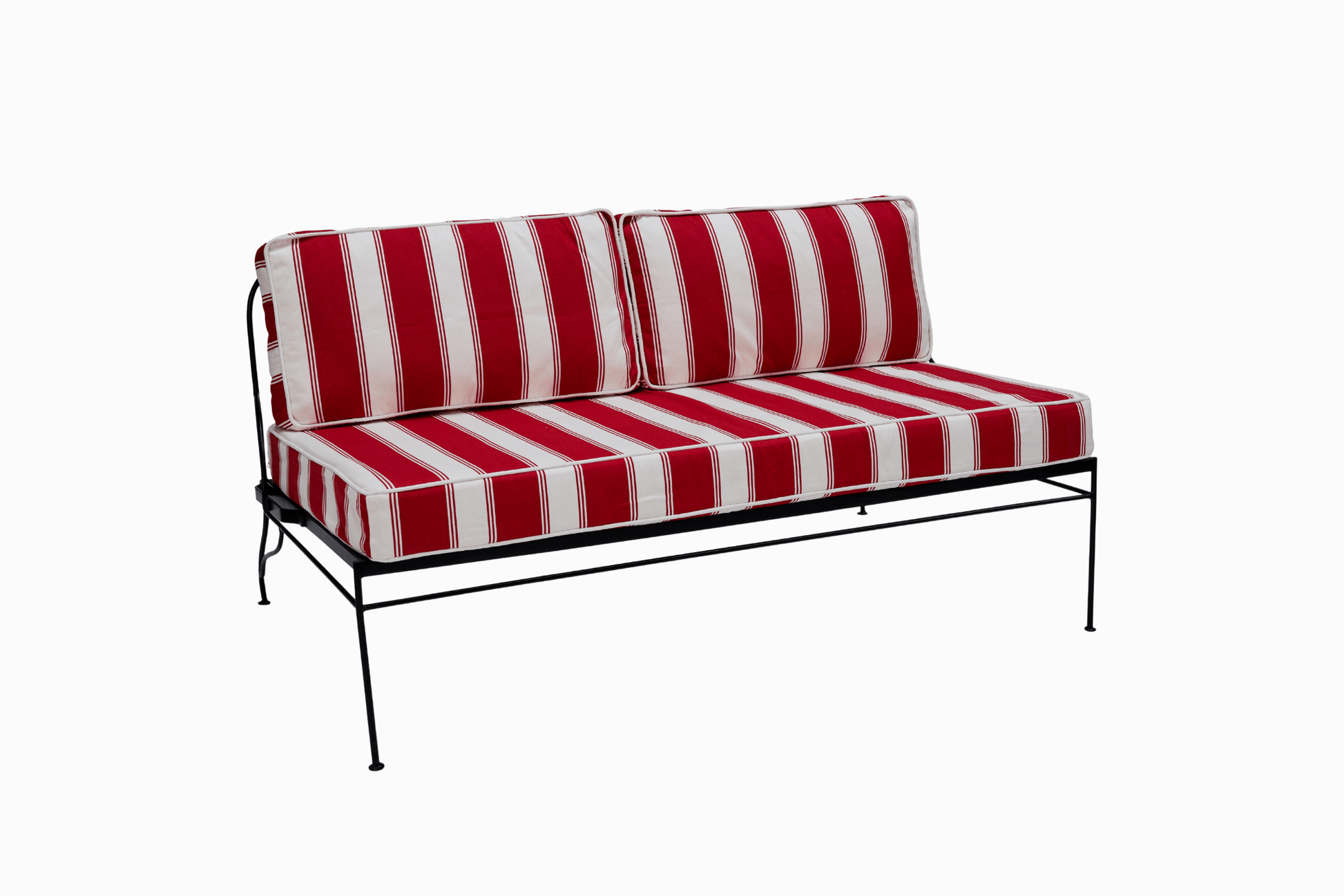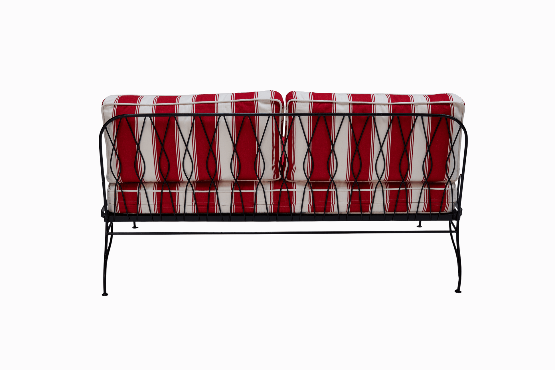 Our Palm Springs Sofa is ideal for indoor or conservatory use. It can be used outdoors as the metal frame is finished in durable gunmetal powder coating. However, the cushions and covers should not be left out in the rain.
