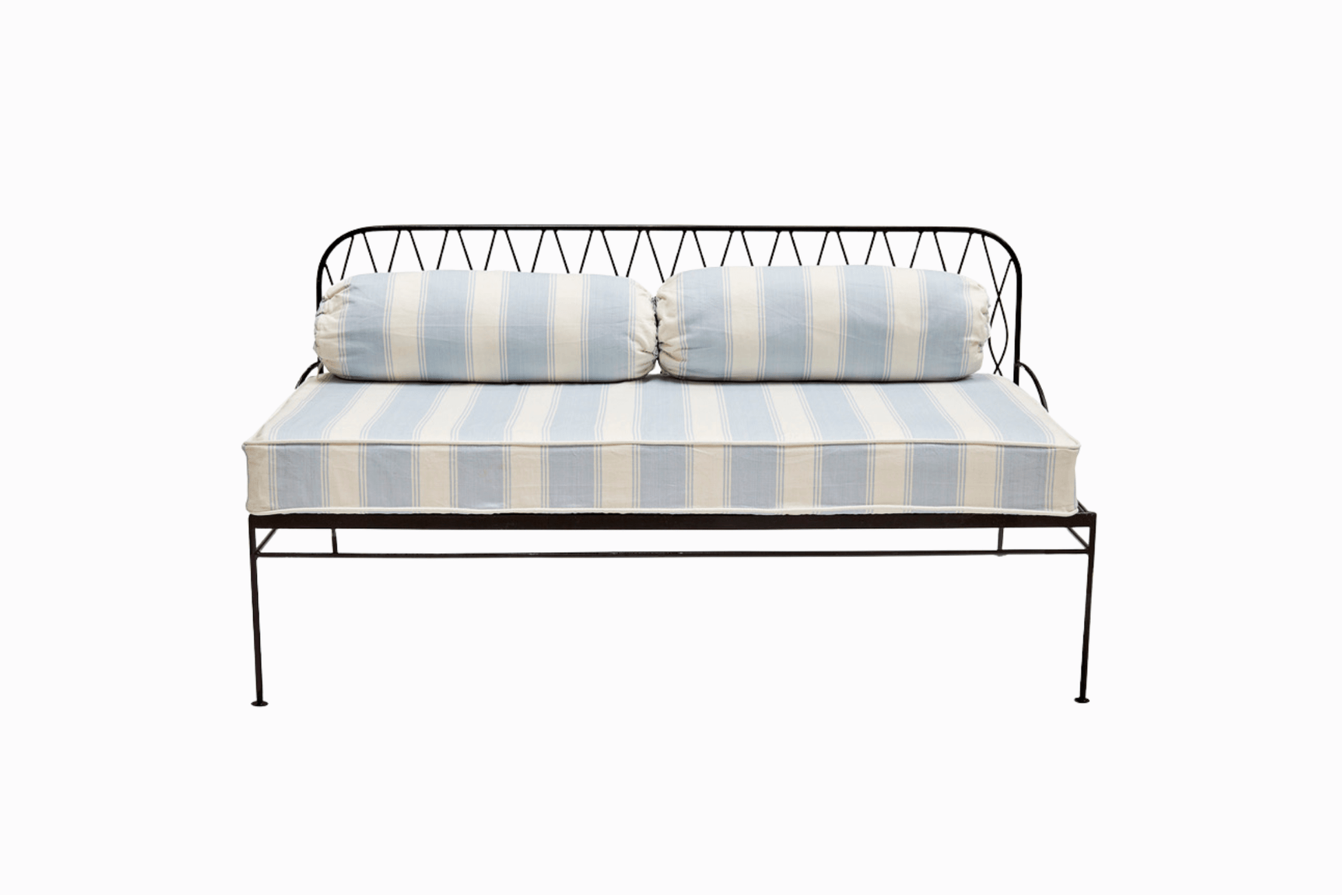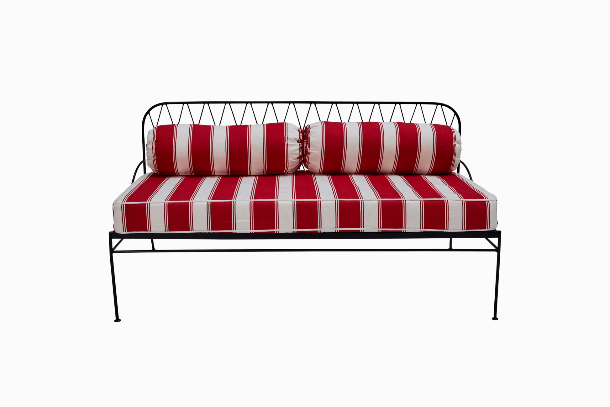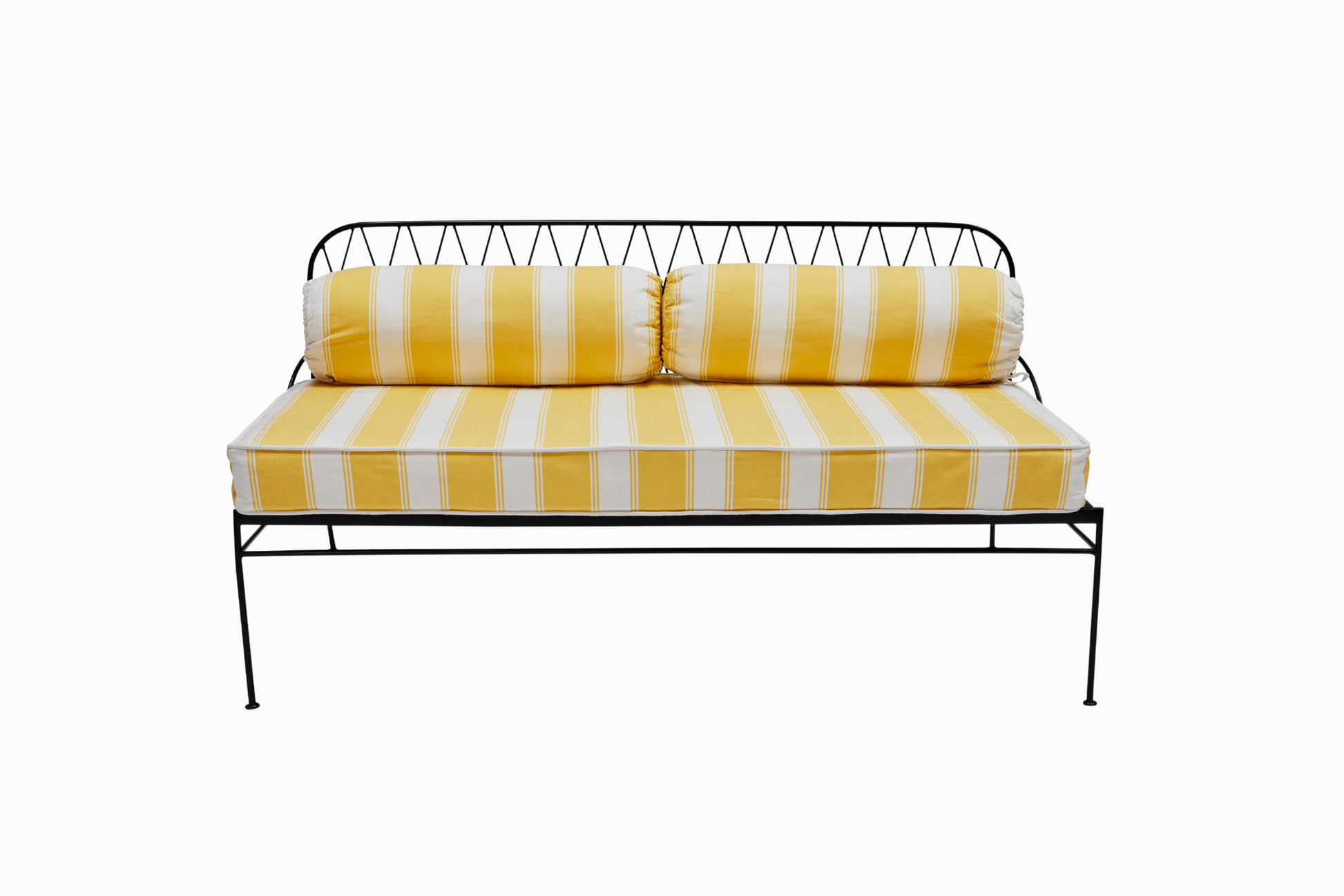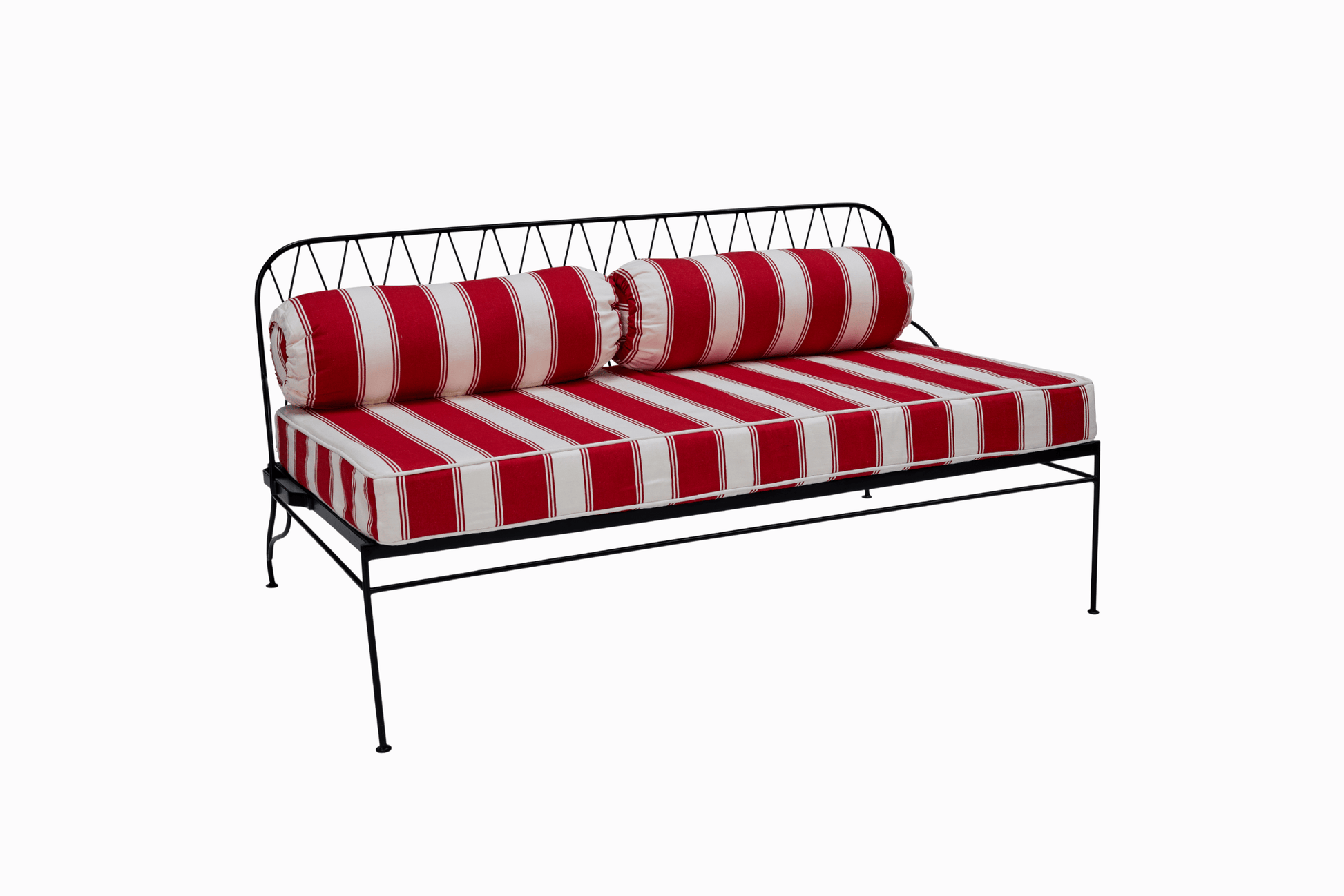Our Palm Springs Sofa is ideal for indoor or conservatory use. It can be used outdoors as the metal frame is finished in durable gunmetal powder coating. However, the cushions and covers should not be left out in the rain.