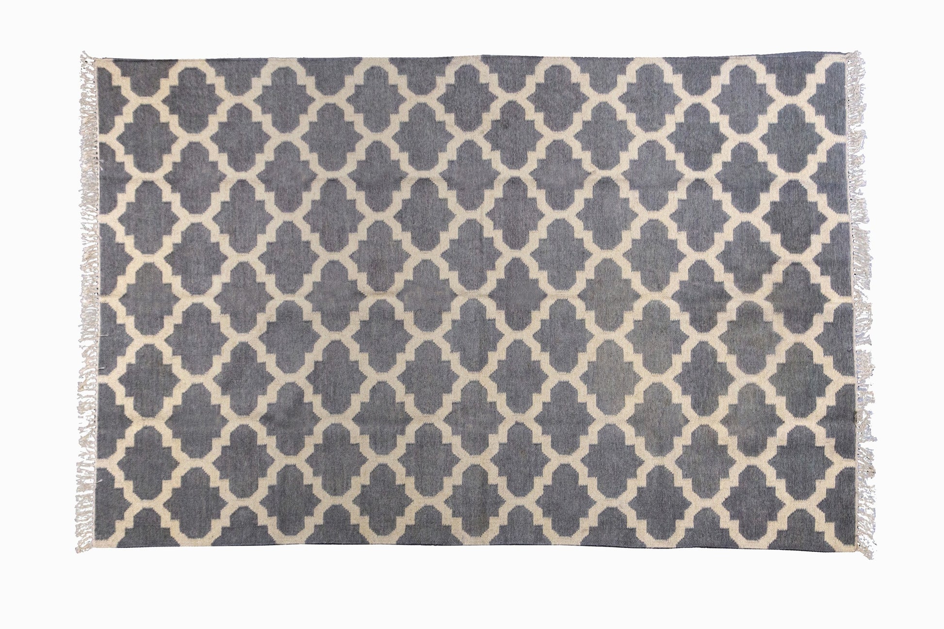 Un joli dhurrie en laine et coton fabriqué au Rajasthan, en Inde. Le tapis a un motif jalli crème et gris. Le tapis illustré est en stock, bien que le motif puisse être réalisé sur commande dans n'importe quelle couleur.