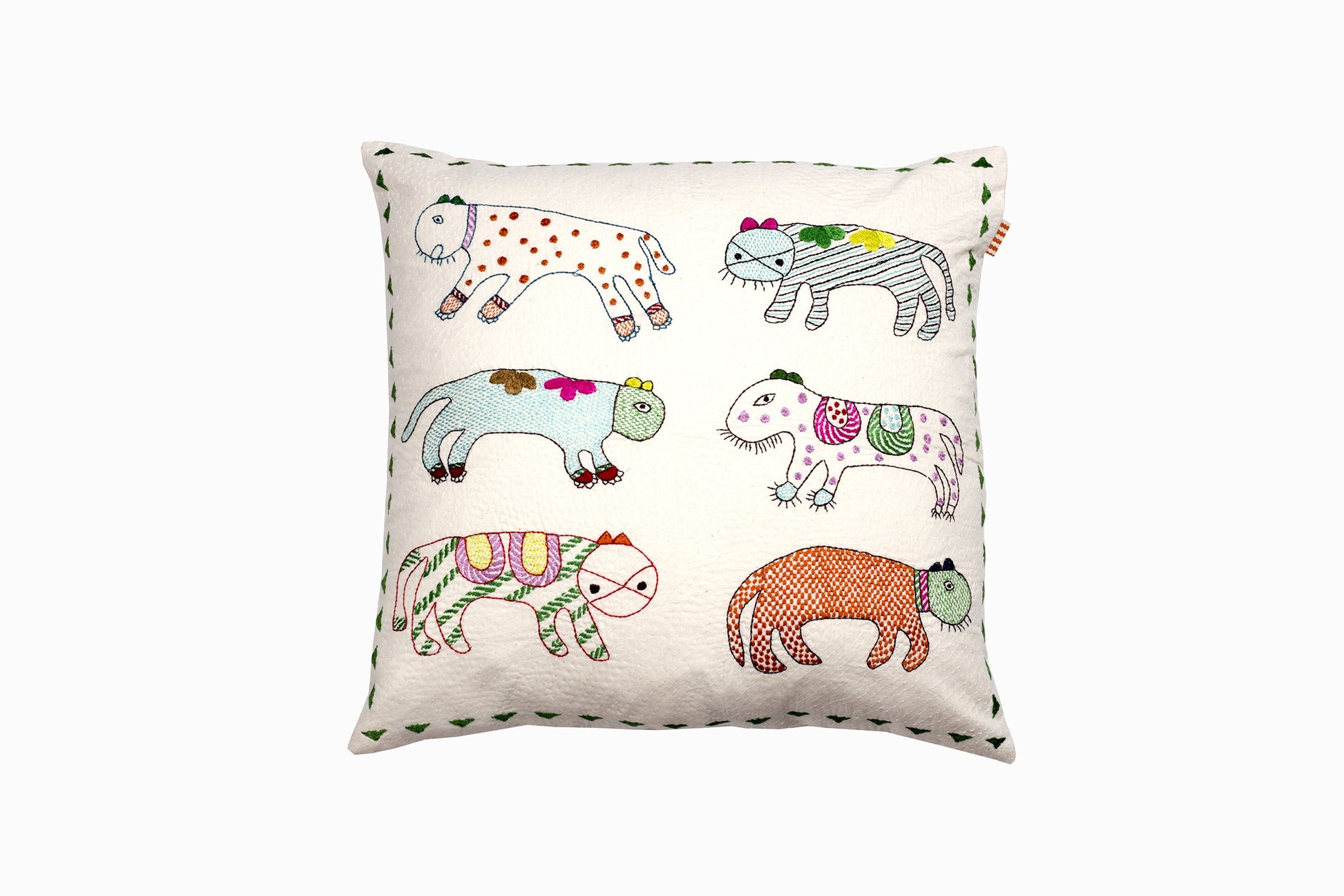 Ces ravissants coussins en coton brodés à la main sont fabriqués à Dhaka, au Bangladesh. Elles sont décorées de tigres dans un style naïf et conviennent parfaitement à une chambre d'enfant.