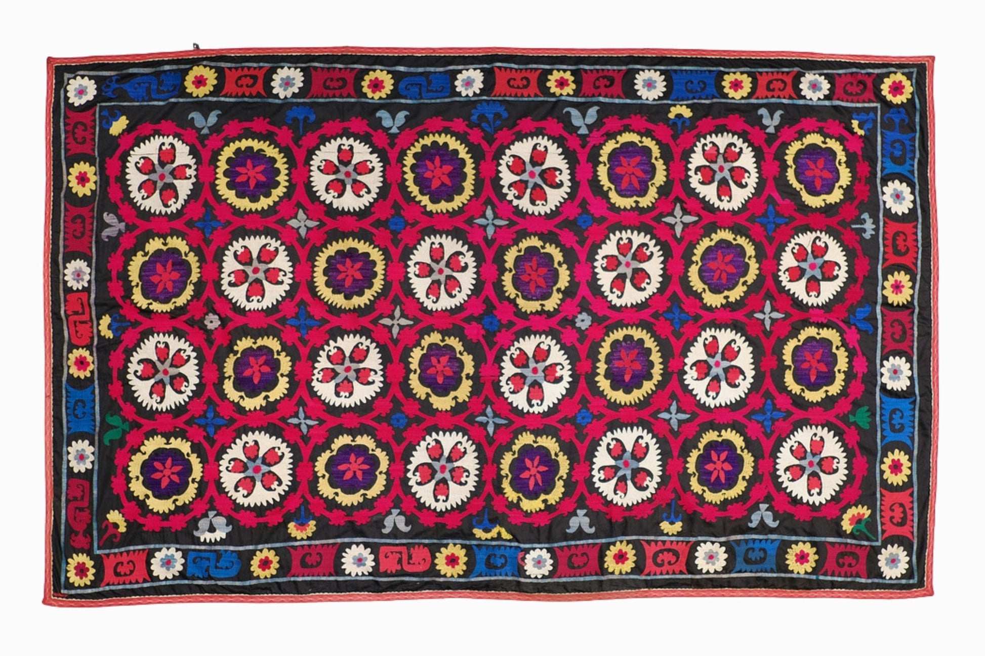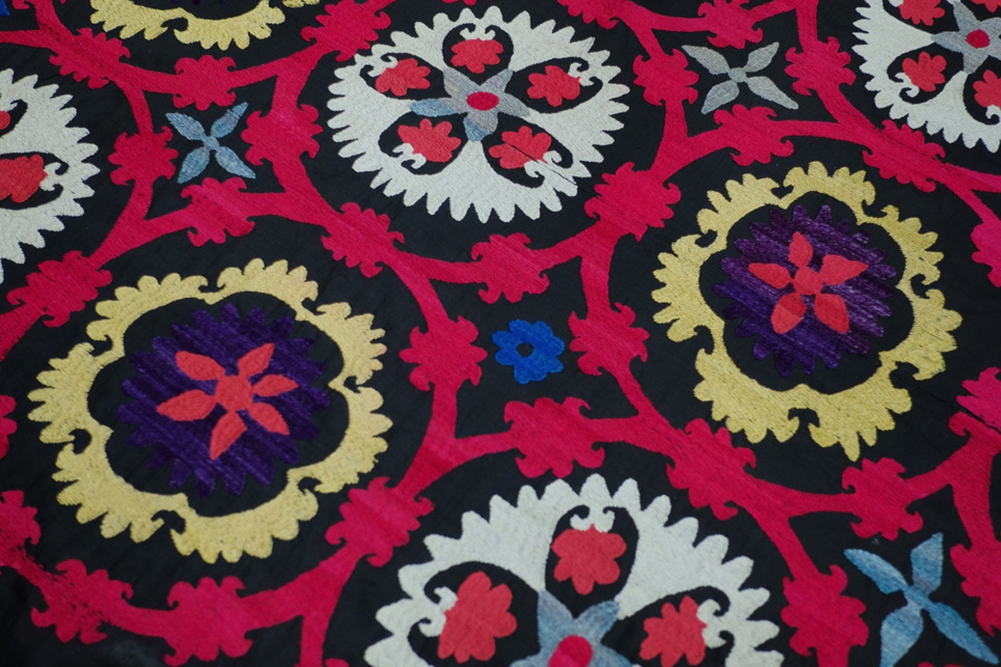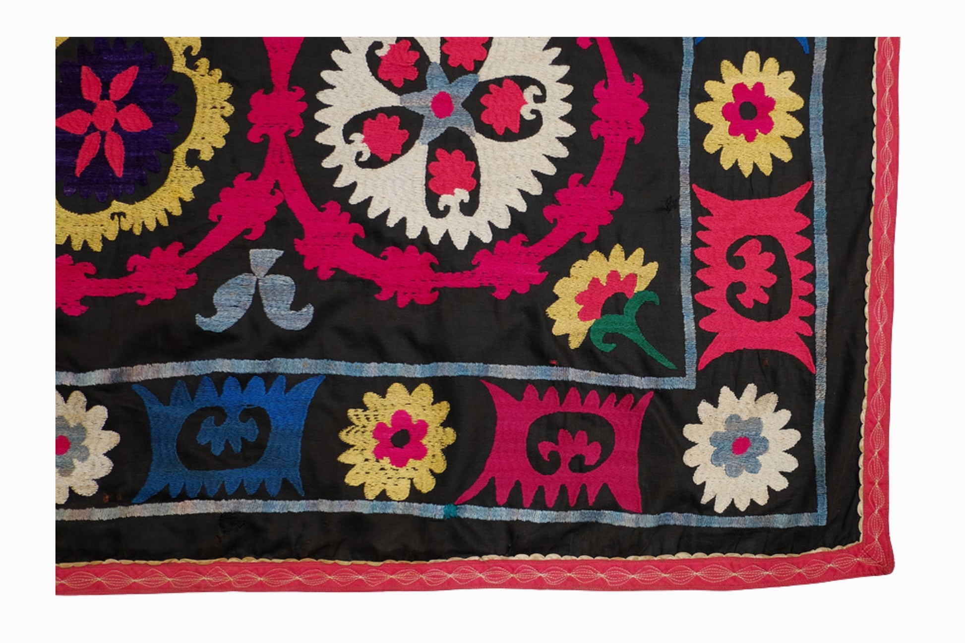 A striking Uzbeki Suzani with multicoloured embroidery on black silk.