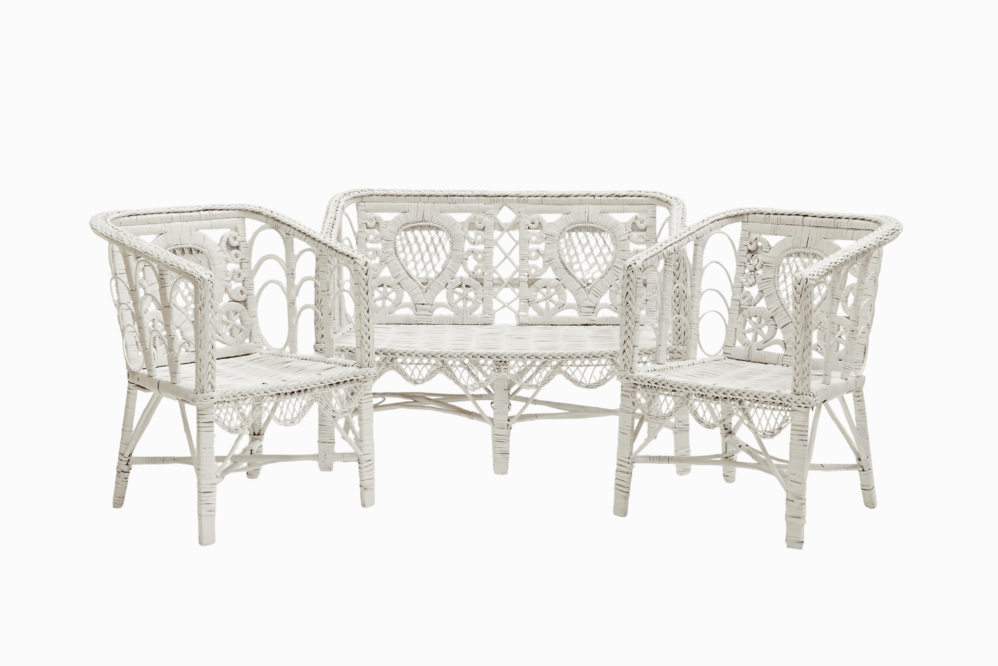 Intricately woven and full of character, this vintage rattan set brings breezy charm and timeless craftsmanship to indoor or covered outdoor spaces. Featuring a beautifully detailed whitewashed finish, the sofa and matching chairs balance airy elegance with relaxed comfort. Perfect for sunrooms, garden rooms, or any space that calls for a touch of nostalgic sophistication.