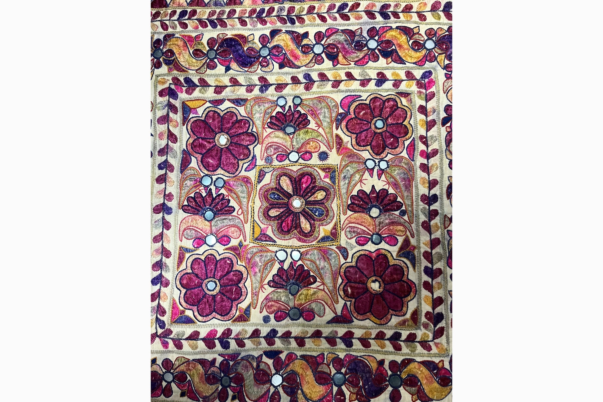 In Gujarati the word chackla means an embroidered panel, traditionally used to cover offerings to deities, or to hang on an inside or outside wall. This chackla would look fabulous framed.