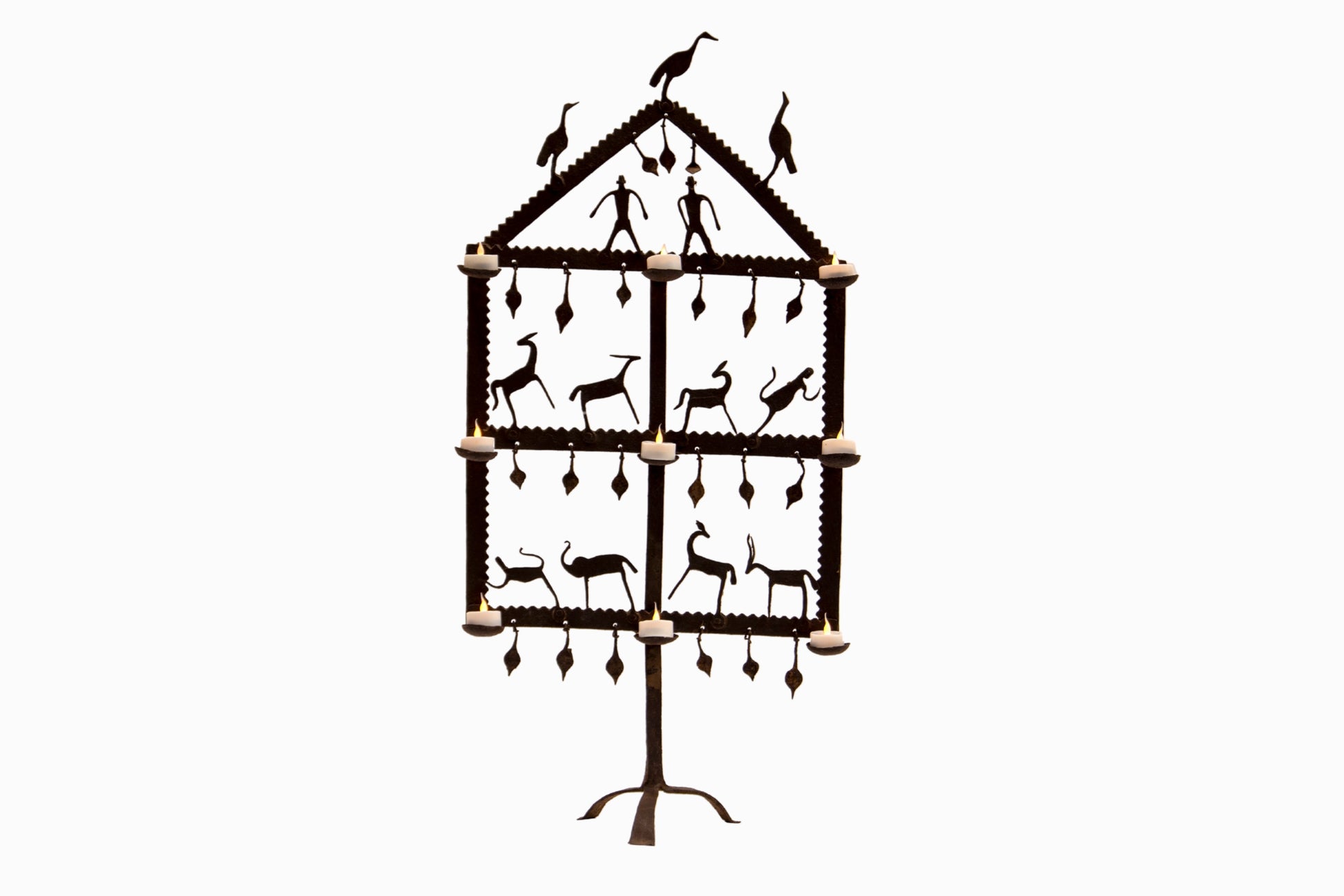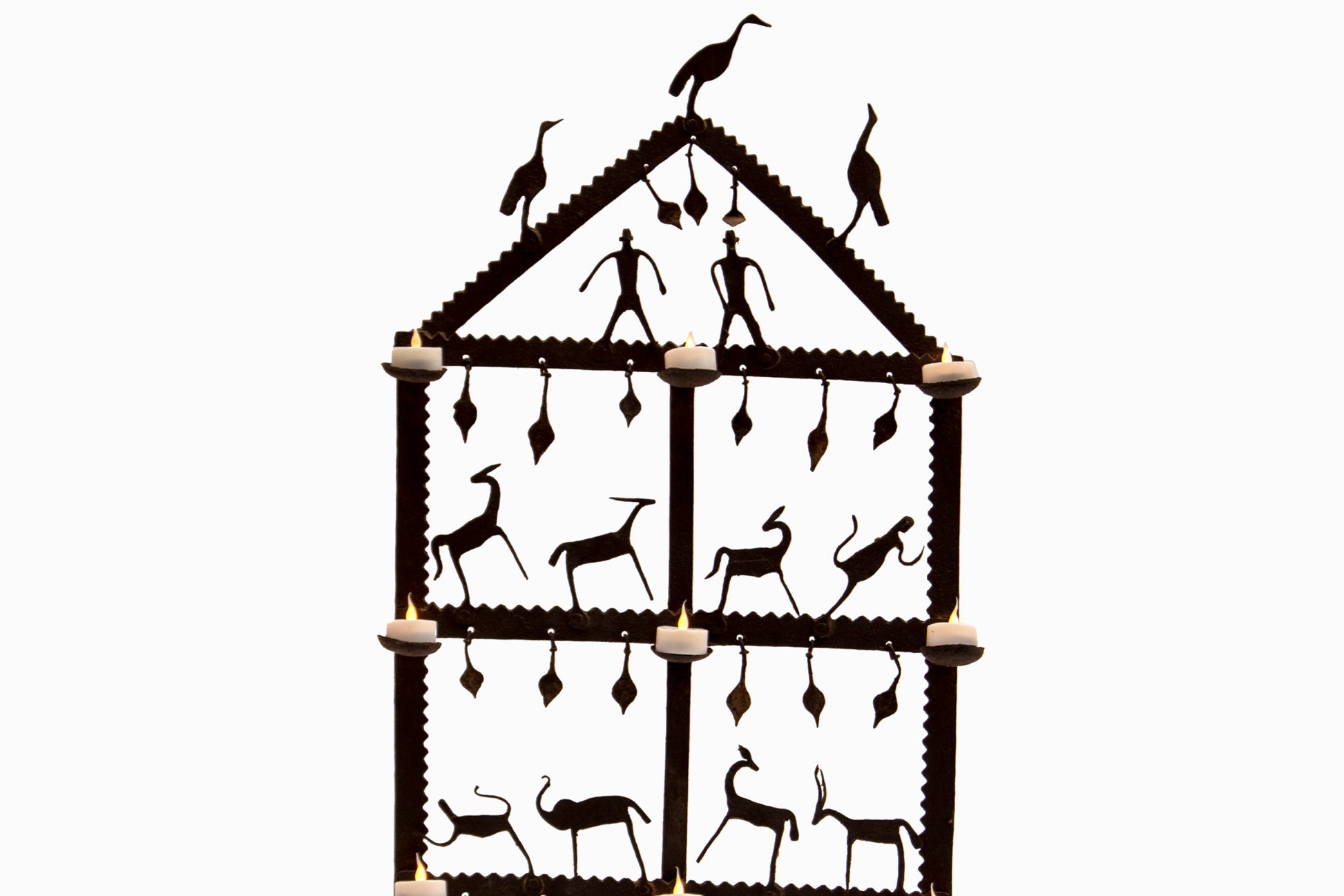 From Rajasthan in India, a candleholder with charming cut-out figures of birds, deer and people.