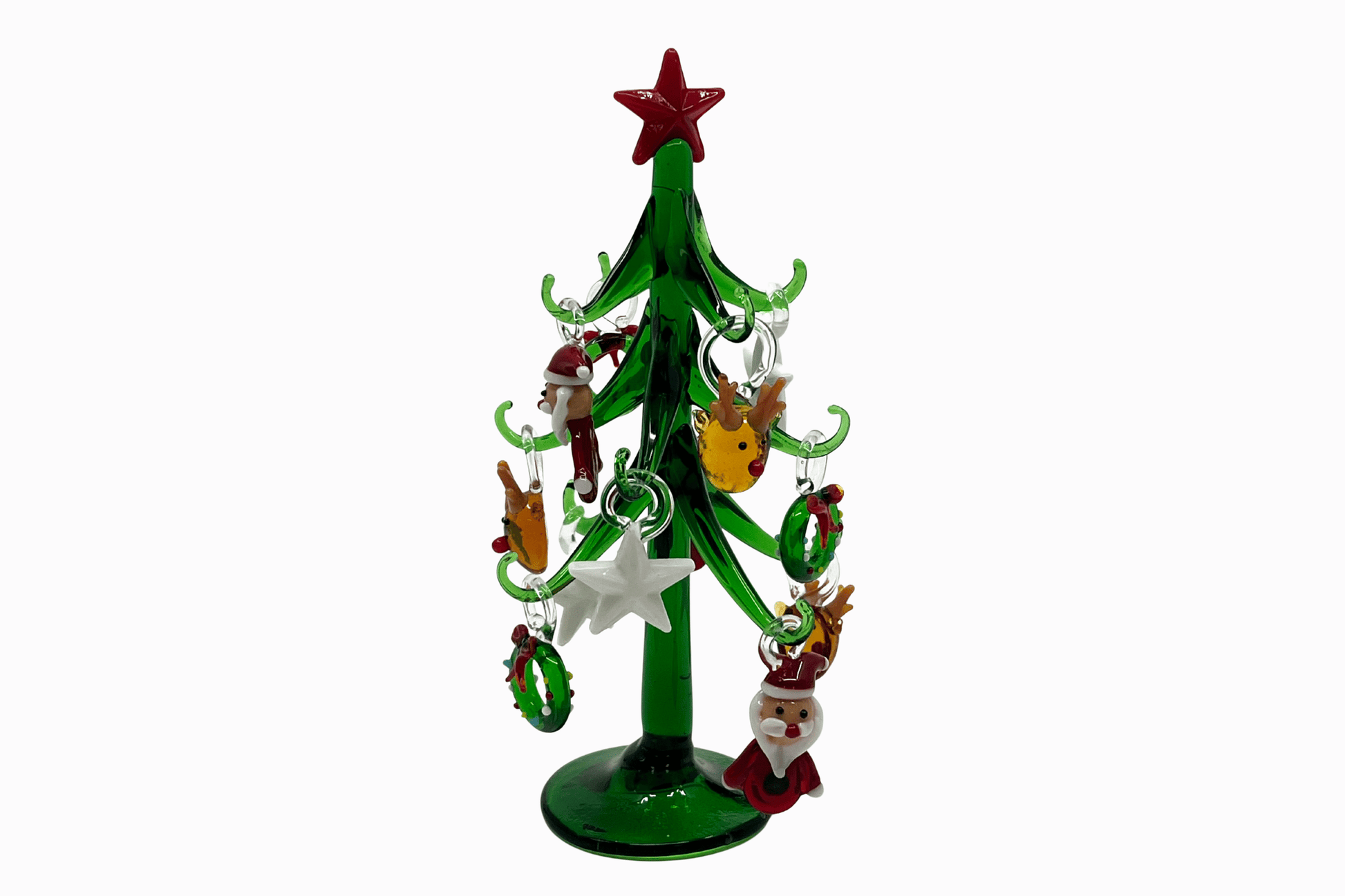 A diminutive Christmas tree made of glass with twelve Christmas baubles to hang on it.